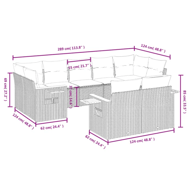 vidaXL Vrtna garnitura 9-delna z blazinami bež poli ratan