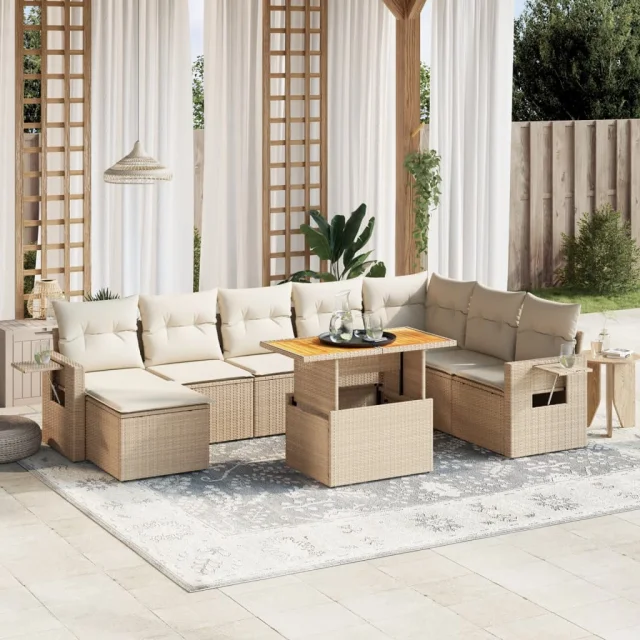 vidaXL Vrtna garnitura 9-delna z blazinami bež poli ratan