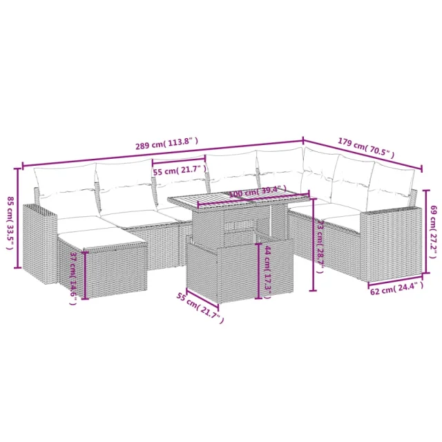 vidaXL Vrtna garnitura 9-delna z blazinami bež poli ratan