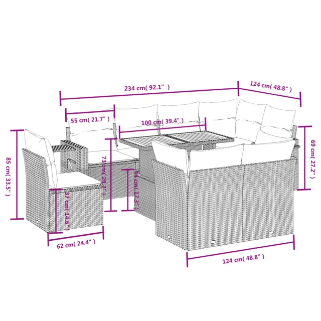 vidaXL Vrtna garnitura 9-delna z blazinami bež poli ratan