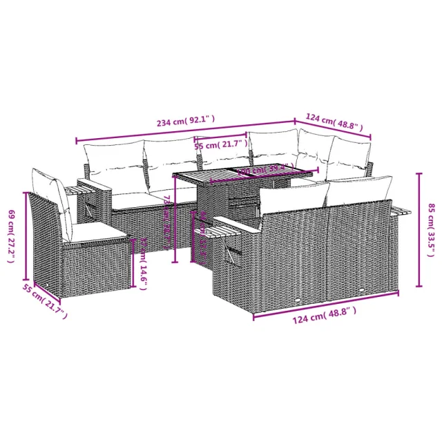vidaXL Vrtna garnitura 9-delna z blazinami bež poli ratan