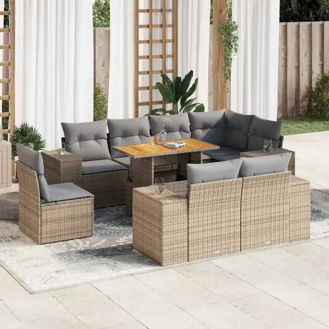 Ta vrtna sedežna garnitura je popoln dodatek za vaše dvorišče, teraso ali verando, saj zagotavlja udoben in vabljiv prostor za klepet z družino in prijatelji ali preprosto za sprostitev in uživanje na prostem. Trpežen material: PE ratan, znan tudi kot poli ratan, je močan sintetični material, ki ne potrebuje vzdrževanja in je videti kot naravni ratan. Je lahek, enostaven za čiščenje in se zaradi svoje vzdržljivosti in odpornosti na vremenske vplive pogosto uporablja za zunanje pohištvo.Funkcija shranjevanja z vodoodporno torbo: Vrtno pohištvo ima pod sedežem prostor za shranjevanje, opremljen z vodoodporno torbo za shranjevanje blazin, igrač in drugih stvari. Notranjo torbo je mogoče varno pritrditi na zunanje pohištvo s kavljem in zanko za večjo stabilnost.Nastavljiva mizna plošča: Z dvigom mizne plošče lahko mizo povišate, s čimer se zunanja klubska mizica spremeni v jedilno mizo. Popolna je za sprejemanje gostov ali uživanje v obrokih na prostem.Prevleko je mogoče odstraniti in oprati: Te sedežne blazine imajo odstranljive prevleke za lažje pranje in vzdrževanje.Modularna zasnova: Ta komplet zunanjega pohištva ima modularno zasnovo, zaradi česar je popolnoma prilagodljiv in enostaven za premikanje, tako da lahko zunanjo garnituro postavite kakor koli želite. Dobro je vedeti:Če želite, da vaše zunanje pohištvo ostane lepo, vam priporočamo, da ga zaščitite z vodoodporno prevleko.Dimenzije vodoodporne vreče: 55 x 53 x 34 cm (D x Š x V)Maksimalna nosilnost (na sedež): 110 kgUV-odpornoPlastične nastavljive nogePotrebno sestavljanje: DaKotni sedež:Barva: BežMaterial: PE ratan, jeklen okvir s prašnim premazomDimenzije: 62 x 62 x 69 cm (Š x G x V)Velikost sedeža: 55 x 55 cm (Š x G)Višina sedeža od tal (brez blazine): 37 cmKotni sedež s naslonom za roke iz ratana:Barva: BežMaterial: PE ratan, jeklen okvir s prašnim premazomDimenzije: 83 x 62 x 69 cm (Š x G x V)Velikost sedeža: 55 x 55 cm (Š x G)Višina sedeža od tal (brez blazine): 37 cmVišina naslonjal za roke od tal: 55 cmŠirina naslona za roke: 27,5 cmSrednji sedež:Barva: BežMaterial: PE ratan, jeklen okvir s prašnim premazomDimenzije: 55 x 62 x 69 cm (Š x G x V)Velikost sedeža: 55 x 55 cm (Š x G)Višina sedeža od tal (brez blazine): 37 cmMiza:Barva: BežMaterial: PE ratan, prašno premazano jeklo, trden akacijev les z oljnim premazomDimenzije: 100 x 55 x 44/73 cm (D x Š x V)Blazina:Barva: Svetlo sivaMaterial prevleke: Tkanina (100 % poliester)Polnilo sedežne blazine: PenaPolnilo hrbtne blazine: bombažna vlaknaDimenzije sedežne blazine: 55 x 55 x 3 cm (Š x G x D)Dimenzije hrbtne blazine: 55 x 45 x 13 cm (D x Š x D)Paket vsebuje:1 x Vrtna miza1 x Kotni kavč s funkcijo shranjevanja z vodoodporno vrečo4 x Kotni sedež z naslonom za roke iz ratana s funkcijo shranjevanja z vodoodporno torbo3 x Srednji kavč s funkcijo shranjevanja z vodoodporno vrečo9 x Blazina za hrbet8 x Sedežna blazina s snemljivo in pralno prevleko 3327391