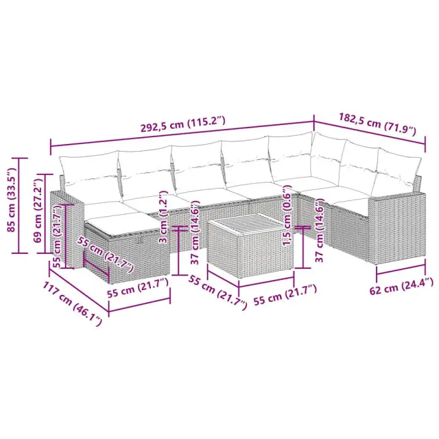 Ta vrtna sedežna garnitura je popoln dodatek za vaše dvorišče, teraso ali verando, saj zagotavlja udoben in vabljiv prostor za klepet z družino in prijatelji ali preprosto za sprostitev in uživanje na prostem. Trpežen material: PE ratan, znan tudi kot poli ratan, je močan sintetični material, ki ne potrebuje vzdrževanja in je videti kot naravni ratan. Je lahek, enostaven za čiščenje in se zaradi svoje vzdržljivosti in odpornosti na vremenske vplive pogosto uporablja za zunanje pohištvo.Funkcija shranjevanja z vodoodporno torbo: Vrtno pohištvo ima pod sedežem prostor za shranjevanje, opremljen z vodoodporno torbo za shranjevanje blazin, igrač in drugih stvari. Notranjo torbo je mogoče varno pritrditi na zunanje pohištvo s kavljem in zanko za večjo stabilnost.Vsestranski stolček za noge: Stolček je vsestransko uporaben, saj služi kot udoben naslon za noge, ko ležite na kavču, ali kot dodaten sedež na vrtu.Prevleko je mogoče odstraniti in oprati: Te sedežne blazine imajo odstranljive prevleke za lažje pranje in vzdrževanje.Modularna zasnova: Ta komplet zunanjega pohištva ima modularno zasnovo, zaradi česar je popolnoma prilagodljiv in enostaven za premikanje, tako da lahko zunanjo garnituro postavite kakor koli želite. Dobro je vedeti:Če želite, da vaše zunanje pohištvo ostane lepo, vam priporočamo, da ga zaščitite z vodoodporno prevleko.Dimenzije vodoodporne vreče: 55 x 53 x 34 cm (D x Š x V)Največja dovoljena teža (na sedež): 110 kgUV-odpornoPlastične nastavljive nogePotrebno sestavljanje: DaKavč z naslonjali za roke:Barva: BežMaterial: PE ratan, jeklen okvir s prašnim premazomDimenzije: 65,5 x 62 x 69 cm (Š x G x V)Velikost sedeža: 55 x 55 cm (Š x G)Višina sedeža od tal (brez blazine): 37 cmVišina naslonjal za roke od tal: 55 cmŠirina naslonjala za roke: 10 cmKotni sedež:Barva: BežMaterial: PE ratan, jeklen okvir s prašnim premazomDimenzije: 62 x 62 x 69 cm (Š x G x V)Velikost sedeža: 55 x 55 cm (Š x G)Višina sedeža od tal (brez blazine): 37 cmSrednji sedež:Barva: BežMaterial: PE ratan, jeklen okvir s prašnim premazomDimenzije: 55 x 62 x 69 cm (Š x G x V)Velikost sedeža: 55 x 55 cm (Š x G)Višina sedeža od tal (brez blazine): 37 cmStolček za noge:Barva: BežMaterial: PE ratan, jeklen okvir s prašnim premazomDimenzije: 55 x 55 x 37 cm (Š x G x V)Vrtna miza:Barva: Bež in rjavaMaterial: PE ratan, prašno premazano jeklo, trden akacijev les z oljnim premazomDimenzije: 55 x 55 x 37 cm (Š x G x V)Blazina:Barva: Kremno belaMaterial prevleke: Tkanina (100 % poliester)Polnilo sedežne blazine: PenaPolnilo hrbtne blazine: bombažna vlaknaDimenzije sedežne blazine: 55 x 55 x 3 cm (Š x G x D)Dimenzije hrbtne blazine: 55 x 45 x 13 cm (D x Š x D) Paket vsebuje:2 x Kavč s funkcijo shranjevanja z vodoodporno vrečo1 x Kotni kavč s funkcijo shranjevanja z vodoodporno vrečo4 x Srednji kavč s funkcijo shranjevanja z vodoodporno vrečo1 x Stolček s funkcijo shranjevanja1 x Vrtna miza8 x Blazina za hrbet8 x Sedežna blazina s snemljivo in pralno prevleko 3325803