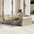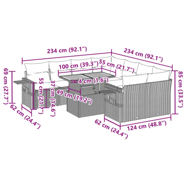 Ta vrtna sedežna garnitura je popoln dodatek za vaše dvorišče, teraso ali verando, saj zagotavlja udoben in vabljiv prostor za klepet z družino in prijatelji ali preprosto za sprostitev in uživanje na prostem. Trpežen material: PE ratan, znan tudi kot poli ratan, je močan sintetični material, ki ne potrebuje vzdrževanja in je videti kot naravni ratan. Je lahek, enostaven za čiščenje in se zaradi svoje vzdržljivosti in odpornosti na vremenske vplive pogosto uporablja za zunanje pohištvo.Funkcija shranjevanja z vodoodporno torbo: Vrtno pohištvo ima pod sedežem prostor za shranjevanje, opremljen z vodoodporno torbo za shranjevanje blazin, igrač in drugih stvari. Notranjo torbo je mogoče varno pritrditi na zunanje pohištvo s kavljem in zanko za večjo stabilnost.Nastavljiva mizna plošča: Z dvigom mizne plošče lahko mizo povišate, s čimer se zunanja klubska mizica spremeni v jedilno mizo. Popolna je za sprejemanje gostov ali uživanje v obrokih na prostem.Prevleko je mogoče odstraniti in oprati: Te sedežne blazine imajo odstranljive prevleke za lažje pranje in vzdrževanje.Modularna zasnova: Ta komplet zunanjega pohištva ima modularno zasnovo, zaradi česar je popolnoma prilagodljiv in enostaven za premikanje, tako da lahko zunanjo garnituro postavite kakor koli želite. Dobro je vedeti:Če želite, da vaše zunanje pohištvo ostane lepo, vam priporočamo, da ga zaščitite z vodoodporno prevleko.Dimenzije vodoodporne vreče: 55 x 53 x 34 cm (D x Š x V)Maksimalna nosilnost (na sedež): 110 kgUV-odpornoPlastične nastavljive nogePotrebno sestavljanje: DaKotni sedež:Barva: BežMaterial: PE ratan, jeklen okvir s prašnim premazomDimenzije: 62 x 62 x 69 cm (Š x G x V)Velikost sedeža: 55 x 55 cm (Š x G)Višina sedeža od tal (brez blazine): 37 cmKotni sedež s naslonom za roke iz ratana:Barva: BežMaterial: PE ratan, jeklen okvir s prašnim premazomDimenzije: 62 x 62 x 69 cm (Š x G x V)Velikost sedeža: 55 x 55 cm (Š x G)Višina sedeža od tal (brez blazine): 37 cmVišina naslonjal za roke od tal: 55 cmŠirina naslonjala za roke: 6 cmVelikost stranske mizice: 25 x 23 cm (D x Š)Srednji sedež:Barva: BežMaterial: PE ratan, jeklen okvir s prašnim premazomDimenzije: 55 x 62 x 69 cm (Š x G x V)Velikost sedeža: 55 x 55 cm (Š x G)Višina sedeža od tal (brez blazine): 37 cmMiza:Barva: BežMaterial: PE ratan, prašno premazano jeklo, trden akacijev les z oljnim premazomDimenzije: 100 x 55 x 44/73 cm (D x Š x V)Blazina:Barva: Kremno belaMaterial prevleke: Tkanina (100 % poliester)Polnilo sedežne blazine: PenaPolnilo hrbtne blazine: bombažna vlaknaDimenzije sedežne blazine: 55 x 55 x 3 cm (Š x G x D)Dimenzije hrbtne blazine: 55 x 45 x 13 cm (D x Š x D)Paket vsebuje:1 x Vrtna miza2 x Kotni kavč s funkcijo shranjevanja z vodoodporno vrečo2 x Kotni sedež z naslonom za roke iz ratana s funkcijo shranjevanja z vodoodporno torbo4 x Srednji kavč s funkcijo shranjevanja z vodoodporno vrečo10 x Blazina za hrbet8 x Sedežna blazina s snemljivo in pralno prevleko 3327131