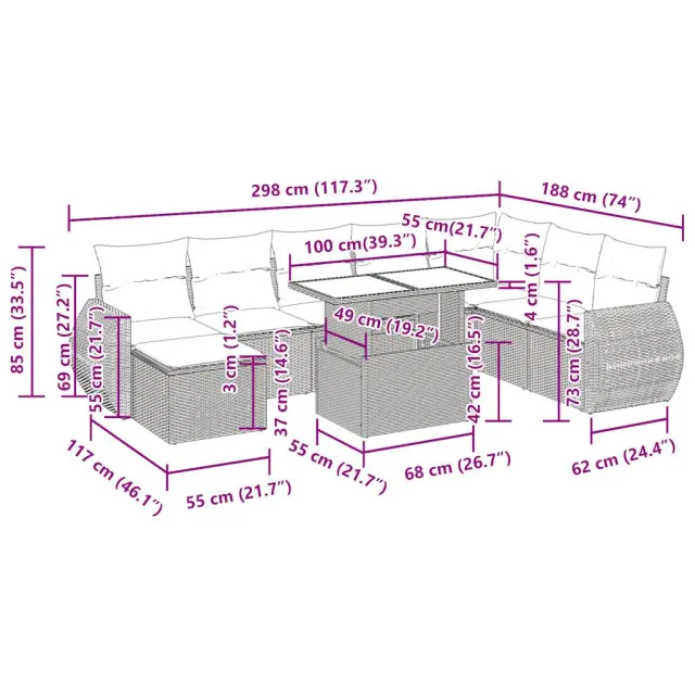 Ta vrtna sedežna garnitura je popoln dodatek za vaše dvorišče, teraso ali verando, saj zagotavlja udoben in vabljiv prostor za klepet z družino in prijatelji ali preprosto za sprostitev in uživanje na prostem. Trpežen material: PE ratan, znan tudi kot poli ratan, je močan sintetični material, ki ne potrebuje vzdrževanja in je videti kot naravni ratan. Je lahek, enostaven za čiščenje in se zaradi svoje vzdržljivosti in odpornosti na vremenske vplive pogosto uporablja za zunanje pohištvo.Funkcija shranjevanja z vodoodporno torbo: Vrtno pohištvo ima pod sedežem prostor za shranjevanje, opremljen z vodoodporno torbo za shranjevanje blazin, igrač in drugih stvari. Notranjo torbo je mogoče varno pritrditi na zunanje pohištvo s kavljem in zanko za večjo stabilnost.Nastavljiva mizna plošča: Z dvigom mizne plošče lahko mizo povišate, s čimer se zunanja klubska mizica spremeni v jedilno mizo. Popolna je za sprejemanje gostov ali uživanje v obrokih na prostem.Prevleko je mogoče odstraniti in oprati: Te sedežne blazine imajo odstranljive prevleke za lažje pranje in vzdrževanje.Modularna zasnova: Ta komplet zunanjega pohištva ima modularno zasnovo, zaradi česar je popolnoma prilagodljiv in enostaven za premikanje, tako da lahko zunanjo garnituro postavite kakor koli želite. Dobro je vedeti:Če želite, da vaše zunanje pohištvo ostane lepo, vam priporočamo, da ga zaščitite z vodoodporno prevleko.Dimenzije vodoodporne vreče: 55 x 53 x 34 cm (D x Š x V)Maksimalna nosilnost (na sedež): 110 kgUV-odpornoPlastične nastavljive nogePotrebno sestavljanje: DaKotni sedež:Barva: BežMaterial: PE ratan, jeklen okvir s prašnim premazomDimenzije: 62 x 62 x 69 cm (Š x G x V)Velikost sedeža: 55 x 55 cm (Š x G)Višina sedeža od tal (brez blazine): 37 cmKotni sedež s naslonom za roke iz ratana:Barva: BežMaterial: PE ratan, jeklen okvir s prašnim premazomDimenzije: 71 x 62 x 69 cm (Š x G x V)Velikost sedeža: 55 x 55 cm (Š x G)Višina sedeža od tal (brez blazine): 37 cmVišina naslonjal za roke od tal: 55 cmSrednji sedež:Barva: BežMaterial: PE ratan, jeklen okvir s prašnim premazomDimenzije: 55 x 62 x 69 cm (Š x G x V)Velikost sedeža: 55 x 55 cm (Š x G)Višina sedeža od tal (brez blazine): 37 cmStolček za noge:Barva: BežMaterial: PE ratan, jeklen okvir s prašnim premazomDimenzije: 55 x 55 x 37 cm (Š x G x V)Miza:Barva: BežMaterial: PE ratan, jeklo s prašnim premazom, kaljeno stekloDimenzije: 100 x 55 x 44/73 cm (D x Š x V)Blazina:Barva: Kremno belaMaterial prevleke: Tkanina (100 % poliester)Polnilo sedežne blazine: PenaPolnilo hrbtne blazine: bombažna vlaknaDimenzije sedežne blazine: 55 x 55 x 3 cm (Š x G x D)Dimenzije hrbtne blazine: 55 x 45 x 13 cm (D x Š x D)Paket vsebuje:1 x Vrtna miza1 x Kotni kavč s funkcijo shranjevanja z vodoodporno vrečo2 x Kotni sedež z naslonom za roke iz ratana s funkcijo shranjevanja z vodoodporno torbo4 x Srednji kavč s funkcijo shranjevanja z vodoodporno vrečo1 x Stolček za noge s funkcijo shranjevanja z vodoodporno vrečo8 x Blazina za hrbet8 x Sedežna blazina s snemljivo in pralno prevleko 3326689