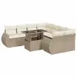 Ta vrtna sedežna garnitura je popoln dodatek za vaše dvorišče, teraso ali verando, saj zagotavlja udoben in vabljiv prostor za klepet z družino in prijatelji ali preprosto za sprostitev in uživanje na prostem. Trpežen material: PE ratan, znan tudi kot poli ratan, je močan sintetični material, ki ne potrebuje vzdrževanja in je videti kot naravni ratan. Je lahek, enostaven za čiščenje in se zaradi svoje vzdržljivosti in odpornosti na vremenske vplive pogosto uporablja za zunanje pohištvo.Funkcija shranjevanja z vodoodporno vrečo: Vsak vrtni sedež ima pod sedežem prostor za shranjevanje, opremljen z vodoodporno vrečo za shranjevanje blazin, igrač in drugih predmetov. Notranja torba ima zgornji pokrov in jo je mogoče varno pritrditi na sedež s kavljem in zanko za večjo stabilnost.Nastavljiva mizna plošča: Z dvigom mizne plošče lahko mizo povišate, s čimer se zunanja klubska mizica spremeni v jedilno mizo. Popolna je za sprejemanje gostov ali uživanje v obrokih na prostem.Prevleko je mogoče odstraniti in oprati: Te sedežne blazine imajo odstranljive prevleke za lažje pranje in vzdrževanje.Robusten in stabilen okvir: Jeklen okvir s prašnim premazom je močan, stabilen, trpežen ter odporen na korozijo in slabe vremenske razmere, kar zagotavlja dolgotrajno delovanje. Dobro je vedeti:Če želite, da vaše zunanje pohištvo ostane lepo, vam priporočamo, da ga zaščitite z vodoodporno prevleko.Dimenzije vodoodporne vreče: 55 x 53 x 34 cm (D x Š x V)Največja dovoljena teža (na sedež): 110 kgUV-odpornoPlastične nastavljive nogePotrebno sestavljanje: DaSrednji sedež:Barva: BežMaterial: PE ratan, jeklen okvir s prašnim premazomDimenzije: 55 x 62 x 69 cm (Š x G x V)Velikost sedeža: 55 x 55 cm (Š x G)Višina sedeža od tal (brez blazine): 37 cmKotni sedež:Barva: BežMaterial: PE ratan, jeklen okvir s prašnim premazomDimenzije: 62 x 62 x 69 cm (Š x G x V)Velikost sedeža: 55 x 55 cm (Š x G)Višina sedeža od tal (brez blazine): 37 cmKavč z naslonjali za roke:Barva: BežMaterial: PE ratan, jeklen okvir s prašnim premazomDimenzije: 71 x 62 x 69 cm (Š x G x V)Velikost sedeža: 55 x 55 cm (Š x G)Višina sedeža od tal (brez blazine): 37 cmVišina naslonjal za roke od tal: 55 cmMiza:Barva: BežMaterial: PE ratan, jeklo s prašnim premazom, kaljeno stekloDimenzije: 100 x 55 x 44/73 cm (D x Š x V)Blazina:Barva: Kremno belaMaterial prevleke: Tkanina (100 % poliester)Polnilo sedežne blazine: PenaPolnilo hrbtne blazine: bombažna vlaknaDimenzije sedežne blazine: 55 x 55 x 3 cm (Š x G x D)Dimenzije hrbtne blazine: 55 x 45 x 13 cm (D x Š x D)Paket vsebuje:4 x Srednji kavč s funkcijo shranjevanja z vodoodporno vrečo2 x Kotni kavč s funkcijo shranjevanja z vodoodporno vrečo2 x Kavč s funkcijo shranjevanja z vodoodporno vrečo1 x Miza10 x Blazina za hrbet8 x Sedežna blazina s snemljivo in pralno prevleko 3326609