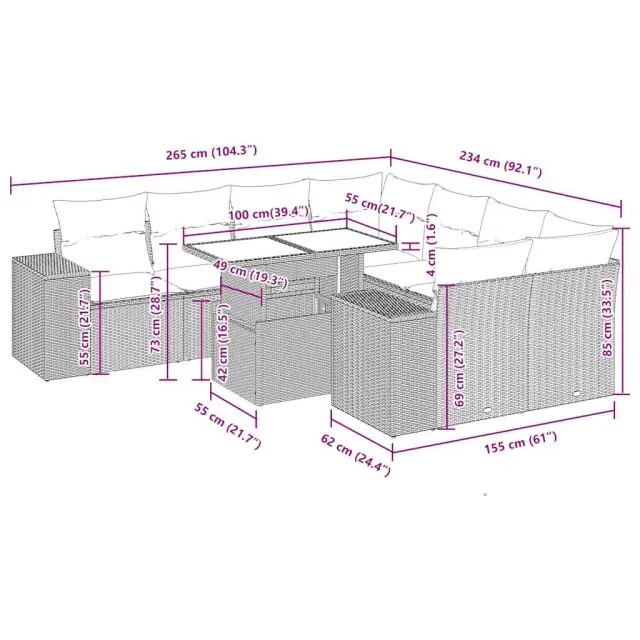 Ta vrtna sedežna garnitura je popoln dodatek za vaše dvorišče, teraso ali verando, saj zagotavlja udoben in vabljiv prostor za klepet z družino in prijatelji ali preprosto za sprostitev in uživanje na prostem. Trpežen material: PE ratan, znan tudi kot poli ratan, je močan sintetični material, ki ne potrebuje vzdrževanja in je videti kot naravni ratan. Je lahek, enostaven za čiščenje in se zaradi svoje vzdržljivosti in odpornosti na vremenske vplive pogosto uporablja za zunanje pohištvo.Funkcija shranjevanja z vodoodporno torbo: Vrtno pohištvo ima pod sedežem prostor za shranjevanje, opremljen z vodoodporno torbo za shranjevanje blazin, igrač in drugih stvari. Notranjo torbo je mogoče varno pritrditi na zunanje pohištvo s kavljem in zanko za večjo stabilnost.Nastavljiva mizna plošča: Z dvigom mizne plošče lahko mizo povišate, s čimer se zunanja klubska mizica spremeni v jedilno mizo. Popolna je za sprejemanje gostov ali uživanje v obrokih na prostem.Prevleko je mogoče odstraniti in oprati: Te sedežne blazine imajo odstranljive prevleke za lažje pranje in vzdrževanje.Modularna zasnova: Ta komplet zunanjega pohištva ima modularno zasnovo, zaradi česar je popolnoma prilagodljiv in enostaven za premikanje, tako da lahko zunanjo garnituro postavite kakor koli želite. Dobro je vedeti:Če želite, da vaše zunanje pohištvo ostane lepo, vam priporočamo, da ga zaščitite z vodoodporno prevleko.Dimenzije vodoodporne vreče: 55 x 53 x 34 cm (D x Š x V)Maksimalna nosilnost (na sedež): 110 kgUV-odpornoPlastične nastavljive nogePotrebno sestavljanje: DaKotni sedež:Barva: BežMaterial: PE ratan, jeklen okvir s prašnim premazomDimenzije: 62 x 62 x 69 cm (Š x G x V)Velikost sedeža: 55 x 55 cm (Š x G)Višina sedeža od tal (brez blazine): 37 cmKotni sedež s naslonom za roke iz ratana:Barva: BežMaterial: PE ratan, jeklen okvir s prašnim premazomDimenzije: 83 x 62 x 69 cm (Š x G x V)Velikost sedeža: 55 x 55 cm (Š x G)Višina sedeža od tal (brez blazine): 37 cmVišina naslonjal za roke od tal: 55 cmŠirina naslona za roke: 27,5 cmSrednji sedež:Barva: BežMaterial: PE ratan, jeklen okvir s prašnim premazomDimenzije: 55 x 62 x 69 cm (Š x G x V)Velikost sedeža: 55 x 55 cm (Š x G)Višina sedeža od tal (brez blazine): 37 cmMiza:Barva: BežMaterial: PE ratan, jeklo s prašnim premazom, kaljeno stekloDimenzije: 100 x 55 x 44/73 cm (D x Š x V)Blazina:Barva: Kremno belaMaterial prevleke: Tkanina (100 % poliester)Polnilo sedežne blazine: PenaPolnilo hrbtne blazine: bombažna vlaknaDimenzije sedežne blazine: 55 x 55 x 3 cm (Š x G x D)Dimenzije hrbtne blazine: 55 x 45 x 13 cm (D x Š x D)Paket vsebuje:1 x Vrtna miza2 x Kotni kavč s funkcijo shranjevanja z vodoodporno vrečo2 x Kotni sedež z naslonom za roke iz ratana s funkcijo shranjevanja z vodoodporno torbo4 x Srednji kavč s funkcijo shranjevanja z vodoodporno vrečo10 x Blazina za hrbet8 x Sedežna blazina s snemljivo in pralno prevleko 3326769