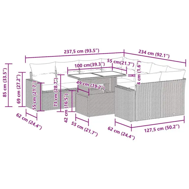 Ta vrtna sedežna garnitura je popoln dodatek za vaše dvorišče, teraso ali verando, saj zagotavlja udoben in vabljiv prostor za klepet z družino in prijatelji ali preprosto za sprostitev in uživanje na prostem. Trpežen material: PE ratan, znan tudi kot poli ratan, je močan sintetični material, ki ne potrebuje vzdrževanja in je videti kot naravni ratan. Je lahek, enostaven za čiščenje in se zaradi svoje vzdržljivosti in odpornosti na vremenske vplive pogosto uporablja za zunanje pohištvo.Funkcija shranjevanja z vodoodporno vrečo: Vsak vrtni sedež ima pod sedežem prostor za shranjevanje, opremljen z vodoodporno vrečo za shranjevanje blazin, igrač in drugih predmetov. Notranja torba ima zgornji pokrov in jo je mogoče varno pritrditi na sedež s kavljem in zanko za večjo stabilnost.Nastavljiva mizna plošča: Z dvigom mizne plošče lahko mizo povišate, s čimer se zunanja klubska mizica spremeni v jedilno mizo. Popolna je za sprejemanje gostov ali uživanje v obrokih na prostem.Prevleko je mogoče odstraniti in oprati: Te sedežne blazine imajo odstranljive prevleke za lažje pranje in vzdrževanje.Robusten in stabilen okvir: Jeklen okvir s prašnim premazom je močan, stabilen, trpežen ter odporen na korozijo in slabe vremenske razmere, kar zagotavlja dolgotrajno delovanje. Dobro je vedeti:Če želite, da vaše zunanje pohištvo ostane lepo, vam priporočamo, da ga zaščitite z vodoodporno prevleko.Dimenzije vodoodporne vreče: 55 x 53 x 34 cm (D x Š x V)Največja dovoljena teža (na sedež): 110 kgUV-odpornoPlastične nastavljive nogePotrebno sestavljanje: DaSrednji sedež:Barva: BežMaterial: PE ratan, jeklen okvir s prašnim premazomDimenzije: 55 x 62 x 69 cm (Š x G x V)Velikost sedeža: 55 x 55 cm (Š x G)Višina sedeža od tal (brez blazine): 37 cmKotni sedež:Barva: BežMaterial: PE ratan, jeklen okvir s prašnim premazomDimenzije: 62 x 62 x 69 cm (Š x G x V)Velikost sedeža: 55 x 55 cm (Š x G)Višina sedeža od tal (brez blazine): 37 cmKavč z naslonjali za roke:Barva: BežMaterial: PE ratan, jeklen okvir s prašnim premazomDimenzije: 65,5 x 62 x 69 cm (Š x G x V)Velikost sedeža: 55 x 55 cm (Š x G)Višina sedeža od tal (brez blazine): 37 cmVišina naslonjal za roke od tal: 55 cmMiza:Barva: BežMaterial: PE ratan, jeklo s prašnim premazom, kaljeno stekloDimenzije: 100 x 55 x 44/73 cm (D x Š x V)Blazina:Barva: Kremno belaMaterial prevleke: Tkanina (100 % poliester)Polnilo sedežne blazine: PenaPolnilo hrbtne blazine: bombažna vlaknaDimenzije sedežne blazine: 55 x 55 x 3 cm (Š x G x D)Dimenzije hrbtne blazine: 55 x 45 x 13 cm (D x Š x D)Paket vsebuje:4 x Srednji kavč s funkcijo shranjevanja z vodoodporno vrečo2 x Kotni kavč s funkcijo shranjevanja z vodoodporno vrečo2 x Kavč s funkcijo shranjevanja z vodoodporno vrečo1 x Miza10 x Blazina za hrbet8 x Sedežna blazina s snemljivo in pralno prevleko 3326289