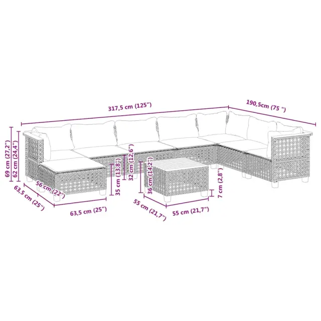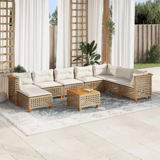 Ta vrtna sedežna garnitura je popoln dodatek za vaše dvorišče, teraso ali verando, saj zagotavlja udoben in vabljiv prostor za klepet z družino in prijatelji ali preprosto za sprostitev in uživanje na prostem. Vzdržljiv material: PE ratan, znan tudi kot poli ratan, je močan sintetični material, ki zahteva malo vzdrževanja in je videti kot naravni ratan. Je lahek, enostaven za čiščenje in se zaradi svoje vzdržljivosti in odpornosti na vremenske vplive pogosto uporablja za zunanje pohištvo.Udobno sedenje: To zunanje pohištvo z debelo oblazinjenimi blazinami zagotavlja udobno sedenje.Prevleko je mogoče odstraniti in oprati: Te sedežne blazine imajo odstranljive prevleke za lažje pranje in vzdrževanje.Stabilna mizna plošča, ki je enostavna za čiščenje: Ta vrtna miza ima ploščo iz akacijevega lesa, ki je čvrsta, vzdržljiva in jo je enostavno čistiti z vlažno krpo.Modularna zasnova: Ta komplet zunanjega pohištva ima modularno zasnovo, zaradi česar je popolnoma prilagodljiv in enostaven za premikanje, tako da lahko zunanjo garnituro postavite kakor koli želite. Dobro je vedeti:Če želite, da vaše zunanje pohištvo ostane lepo, vam priporočamo, da ga zaščitite z vodoodporno prevleko.Maksimalna nosilnost (na sedež): 110 kgUV-odpornoLesene nogePotrebno sestavljanje: DaKotni sedež:Barva: BežMaterial: PE ratan, jeklo s prašnim premazom, trden akacijev les z naravnim oljnim premazomDimenzije: 63,5 x 63,5 x 62 cm (Š x G x V)Velikost sedeža: 56 x 56 cm (Š x G)Višina sedeža, merjena od tal (brez blazine): 32 cmSrednji sedež:Barva: BežMaterial: PE ratan, jeklo s prašnim premazom, trden akacijev les z naravnim oljnim premazomDimenzije: 63,5 x 63,5 x 62 cm (Š x G x V)Velikost sedišča: 63 x 56 cm (Š x G)Višina sedeža, merjena od tal (brez blazine): 32 cmStolček za noge:Barva: BežMaterial: PE ratan, jeklo s prašnim premazom, trden akacijev les z naravnim oljnim premazomDimenzije: 63,5 x 56 x 32 cm (Š x G x V)Višina sedeža, merjena od tal (brez blazine): 32 cmMiza:Barva: BežMaterial: PE ratan, jeklo s prašnim premazom, trden akacijev les z naravnim oljnim premazomDimenzije: 55 x 55 x 36 cm (D x Š x V)Blazina:Barva: Kremno belaMaterial prevleke: Tkanina (100 % poliester)Polnilo sedežne blazine: PenaPolnilo hrbtne blazine: bombažna vlaknaDimenzije sedežne blazine (kotna): 56,5 x 56,5 x 3 cm (Š x G x D)Dimenzije sedežne blazine (srednja): 63,5 x 56,5 x 3 cm (Š x G x D)Dimenzije hrbtne blazine (kotna): 52 x 35 x 10 cm (D × Š × D)Dimenzije hrbtne blazine (sredinska): 63 x 35 x 10 cm (D x Š x D)Paket vsebuje:3 x Kotni kavč4 x Srednji sedež1 x Stolček za noge1 x Vrtna miza10 x Blazina za hrbet8 x Sedežna blazina s snemljivo in pralno prevleko 3261964