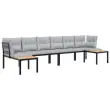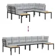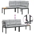 Ta vrtna sedežna garnitura je popoln dodatek za vaše dvorišče, teraso ali verando, saj zagotavlja udoben in vabljiv prostor za klepet z družino in prijatelji ali preprosto za sprostitev in uživanje na prostem. Robusten in stabilen okvir: Jeklen okvir s prašnim premazom je močan, stabilen, trpežen ter odporen na korozijo in slabe vremenske razmere, kar zagotavlja dolgotrajno delovanje.Priročna stranska mizica: To zunanje pohištvo ima stransko mizico, ki zagotavlja priročen prostor za shranjevanje potrebščin na dosegu roke.Udobno sedenje: To zunanje pohištvo z debelo oblazinjenimi blazinami zagotavlja udobno sedenje. Prevleko je mogoče odstraniti in oprati: Te sedežne blazine imajo odstranljive prevleke za lažje pranje in vzdrževanje.Modularna zasnova: Ta komplet zunanjega pohištva ima modularno zasnovo, zaradi česar je popolnoma prilagodljiv in enostaven za premikanje, tako da lahko zunanjo garnituro postavite kakor koli želite. Dobro je vedeti:Če želite, da vaše zunanje pohištvo ostane lepo, vam priporočamo, da ga zaščitite z vodoodporno prevleko.Maksimalna nosilnost (na sedež): 110 kgPotrebno sestavljanje: DaVrtna klop (s 3 nasloni):Barva: ČrnaMaterial: Jeklo s prašnim premazomDimenzije: 118 x 63 x 78 cm (Š x G x V)Velikost sedeža: 110 x 55 cm (Š x G)Višina sedeža, merjena od tal: 39,5 cmVrtna klop s stransko mizico:Barva: ČrnaMaterial: Jeklo s prašnim premazomDimenzije: 110 x 63 x 78 cm (Š x G x V)Velikost sedeža: 80 x 50 cm (Š x G)Velikost stranske mizice: 30 x 55 cm (Š x G)Višina sedeža, merjena od tal: 39,5 cmBlazina:Barva: Svetlo sivaMaterial prevleke: Tkanina (100 % poliester)Polnilo sedežne blazine: PenaPolnilo hrbtne blazine: PP bombažDimenzije sedežne blazine: 80/110x 55 x 6 cm (Š x G x D)Dimenzije blazine za hrbet: 50 x 43 x 12 cm (D x Š x D)Paket vsebuje:4 x Vrtna klop4 x Blazina za hrbet8 x Sedežna blazina s snemljivo in pralno prevleko 3283670