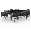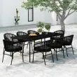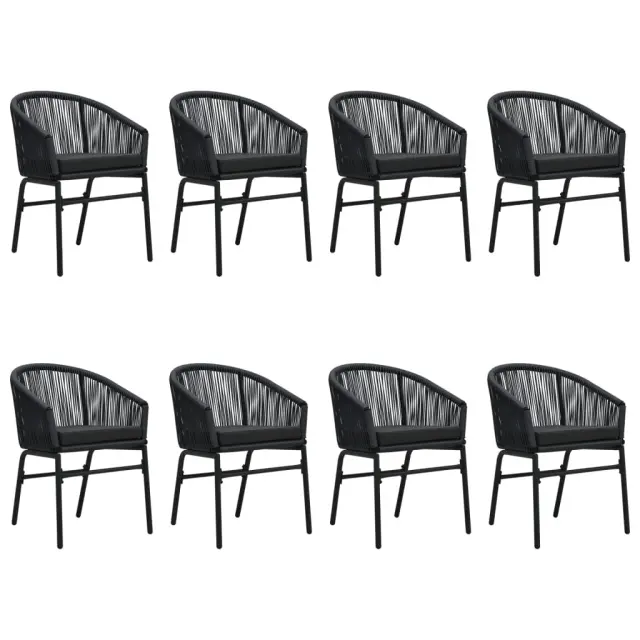 S to vrtno jedilno garnituro lahko ustvarite privlačen in prijeten zunanji prostor! Ta vrtna jedilna garnitura je izdelana iz prašno premazanega jeklenega okvirja, ki zagotavlja trdnost in stabilnost za vsakodnevno uporabo na prostem. Gladka steklena površina je preprosta za čiščenje z vlažno krpo ter popolna za odlaganje obrokov, pijače in okrasnih predmetov. Stoli za teraso so izdelani iz PVC ratana, zato so vzdržljivi ter odporni na slabo vreme in UV žarke. Vsak sedež ima odstranljivo, debelo podloženo blazino za dodatno udobje med počivanjem. Opomba: Da bi podaljšali življenjsko dobo vašega zunanjega pohištva, vam priporočamo, da ga zaščitite z vodoodporno prevleko.Miza:Barva: ČrnaMaterial: Jeklo s prašnim premazom, kaljeno stekloDimenzije: 200 x 100 x 74 cm (D x Š x V)Debelina stekla: 5 mmStol:Barva: ČrnaMaterial: PVC ratan, jeklo s prašnim premazomMaterial blazine: Tkanina (100 % poliester)Dimenzije: 58 x 58 x 78 cm (Š x G x V)Višina sedeža, merjena od tal: 46 cmPotrebno sestavljanje: DaPaket vsebuje:1 x Miza8 x Stol8 x Blazina za sedež 3099244