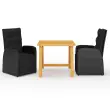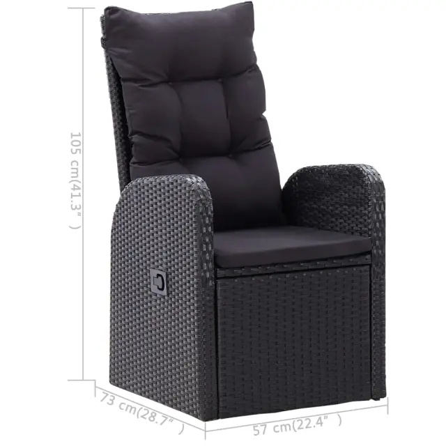 S to vrtno jedilno garnituro lahko ustvarite privlačen in prijeten zunanji prostor! Jedilna miza je narejena iz trdnega akacijevega lesa z oljnim premazom, zato je stabilna, trpežna in enostavna za vzdrževanje. Jedilni stoli imajo jeklen okvir s prašnim premazom, ki je prekrit z vremensko odpornim PE ratanom, zato so stoli trdni in enostavni za čiščenje. Z nastavljivim naslonjalom za hrbet in noge lahko udobno sedite in se resnično sprostite. Naslonjalo za hrbet se prilagaja s potegom stranskega gumba. Zahvaljujoč lahki konstrukciji so stoli precej preprosti za premikanje. Priložene so tudi zelo udobne, debelo podložene blazine, ki zagotavljajo izjemno udobje. Prevleke iz poliestra ne potrebujejo veliko vzdrževanja, poleg tega se jih lahko sname in opere. Pomembna opomba: Če želite, da vam bo jedilna garnitura služila še dolgo, priporočamo, da jo v primeru dežja, snega ali zmrzali pokrijete.Miza:Material: Trden akacijev les z oljnim premazomDimenzije: 88 x 88 x 74 cm (D x Š x V)Stol:Barva: ČrnaBarva blazin: ČrnaMaterial: PE (polietilen) ratan, jeklo s prašnim premazomMaterial prevlek za blazine: 100 % poliesterDebelina blazine: 4 cmDimenzije (dvignjeno naslonjalo): 57 x 73 x 105 cm (Š x G x V)Dimenzije (spuščeno naslonjalo): 57 x 127 x 97 cm (Š x G x V)Širina sedeža: 47 cmGlobina sedeža: 53 cmVišina sedeža, merjena od tal, brez blazine: 41 cmVišina naslonjala za roke, merjena od tal: 63 cmPotrebno sestavljanje: DaPaket vsebuje:1 x Miza2 x Stol2 x Sedežna blazina2 x Blazina za hrbet 3068713