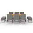 S to vrtno jedilno garnituro lahko ustvarite privlačen in prijeten zunanji prostor! Jedilna miza je narejena iz trdnega akacijevega lesa z oljnim premazom, zato je stabilna, trpežna in enostavna za vzdrževanje. Jedilni stoli imajo jeklen okvir s prašnim premazom, ki je prekrit z vremensko odpornim PE ratanom, zato so trdni in enostavni za čiščenje. Zunanji stol z ukrivljenim naslonjalom za hrbet in naslonjalom za roke ima bolj ergonomično obliko za največje udobje. Naslonjala za roke so čudovito okrašena s trdnim akacijevim lesom, ki daje pridih rustikalnega šarma. Vsak sedež ima priloženo odstranljivo debelo podloženo blazino, ki nudi največje udobje med sedenjem. Pomembna opomba: Če želite, da vam bo jedilna garnitura služila še dolgo, priporočamo, da jo v primeru dežja, snega ali zmrzali pokrijete.Miza:Material: Trden akacijev les z oljnim premazomDimenzije: 200 x 90 x 74 cm (D x Š x V)Stol/stolček:Barva: SivaBarva blazine: Temno sivaMaterial: PE (polietilen) ratan, jeklo s prašnim premazom, trden akacijev les z oljnim premazomDimenzije stola: 52 x 57 x 84 cm (Š x G x V)Velikost sedeža: 39/44, 5 x 46 cm (Š x G)Višina sedeža, merjena od tal: 42 cmVišina naslonjala za roke, merjena od tal: 62/65 cmVelikost naslonjala: 38/45 x 53 cm (Š x V)Dimenzije stolčka: 41,5 x 41,5 x 42,5 cm (Š x G x V)Debelina blazine za sedež: 4 cmPotrebno sestavljanje: DaPaket vsebuje:1 x Miza6 x Stol4 x Stolček10 x Blazina 3067876