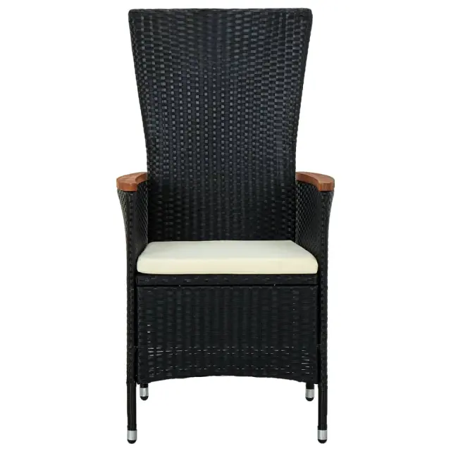 Ta elegantna vrtna jedilna garnitura bo osrednja točka vašega vrta ali terase! To je odlična izbira za obedovanje ali sproščanje na prostem! Prašno premazan jeklen okvir zagotavlja trdnost mize in stolov za vsakodnevno uporabo na prostem. Zahvaljujoč vodoodpornemu PE ratanu so stoli preprosti za čiščenje in trpežni. Naslonjalo se nagiba s potegom gumba na strani. Zahvaljujoč lahki konstrukciji je premikanje preprosto. Debelo podložene sedežne blazine dodajajo udobje. Prevleke iz poliestra so preproste za vzdrževanje, odstranljive in pralne. Gladka steklena površina je preprosta za čiščenje z vlažno krpo ter popolna za odlaganje obrokov, pijače in okrasnih predmetov. Opomba: Da bi podaljšali življenjsko dobo vašega zunanjega pohištva, vam priporočamo, da ga zaščitite z vodoodporno prevleko.Barva: ČrnaBarva blazin: Kremno belaMaterial: PE ratan, trden akacijev les, prašno premazano jeklo, stekloMaterial prevlek za blazine: 100 % poliesterDimenzije mize: 140 x 70 x 74 cm (D x Š x V)Dimenzije stola (nespuščeno naslonjalo): 58 x 62 x 108 cm (Š x G x V)Dimenzije stola (spuščeno naslonjalo): 58 x 90 x 91 cm (Š x G x V)Debelina blazine: 5 cmŠirina sedeža: 47 cmGlobina sedeža: 47 cmVišina sedeža od tal brez blazine: 43 cmVišina naslona za roke, merjena od tal: 67 cmPotrebno sestavljanje: DaPaket vsebuje:1 x Miza6 x Stol6 x Blazina za sedež 3099446