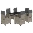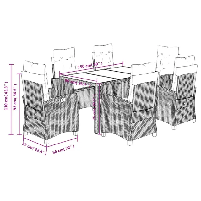 Ta vrtna jedilna garnitura je odlična izbira za večerjo na prostem ali za sprostitev na vrtu, dvorišču ali terasi. Vzdržljiv material: PE ratan, znan tudi kot poli ratan, je močan sintetični material, ki zahteva malo vzdrževanja in je videti kot naravni ratan. Je lahek, enostaven za čiščenje in se zaradi svoje vzdržljivosti in odpornosti na vremenske vplive pogosto uporablja za zunanje pohištvo. Nastavljivo naslonjalo: Ta vrtni sedež ima ročaj. S potegom ročaja lahko naslonjalo nastavite v poljuben položaj in ga hitro vrnete v prvotni položaj.Steklena mizna plošča: Površina zunanje mize je izdelana iz močnega in trpežnega kaljenega stekla, kar omogoča enostavno čiščenje z vlažno krpo in vašemu zunanjemu prostoru doda pridih elegance. Udobno sedenje: To zunanje pohištvo z debelo oblazinjenimi blazinami zagotavlja udobno sedenje. Prevleko je mogoče odstraniti in oprati: Te sedežne blazine imajo odstranljive prevleke za lažje pranje in vzdrževanje. Dobro je vedeti:Če želite, da vaše zunanje pohištvo ostane lepo, vam priporočamo, da ga zaščitite z vodoodporno prevleko.Maksimalna nosilnost (na sedež): 110 kgUV-odpornoPotrebno sestavljanje: DaVrtna miza:Barva: SivaMaterial: PE ratan, jeklo s prašnim premazom, kaljeno stekloDimenzije: 150 x 90 x 75 cm (D x Š x V)Vrtni naslanjač:Barva: SivaMaterial: PE ratan, jeklen okvir s prašnim premazomDimenzije v sedečem položaju: 57 x 66 x 93 cm (Š x G x V)Dimenzije v ležečem položaju: 57 x 90 x 83 cm (Š x G x V)Velikost sedeža: 48 x 54 cm (Š x G)Višina sedeža, merjena od tal: 43,5 cmVišina naslonjala za roke, merjena od tal: 62 cmNastavljiv vrtni stol z oporo za noge:Barva: SivaMaterial: PE ratan, jeklen okvir s prašnim premazomDimenzije v sedečem položaju: 57 x 66 x 93 cm (Š x G x V)Dimenzije v ležečem položaju: 57 x 117 x 83 cm (Š x G x V)Velikost sedeža: 48 x 54 cm (Š x G)Višina sedeža, merjena od tal: 43,5 cmVišina naslonjala za roke, merjena od tal: 62 cmBlazina:Barva: Temno sivaMaterial prevleke: Tkanina (100 % poliester)Polnilo sedežne blazine: PenaPolnilo hrbtne blazine: bombažna vlaknaDimenzije sedežne blazine (majhna): 48 x 54 x 3 cm (Š x G x D)Dimenzije sedežne blazine (velika): 48 x 93 x 3 cm (Š x G x D)Dimenzije hrbtne blazine: 67 x 48 x 10 cm (D x Š x D)Paket vsebuje:1 x Vrtna miza4 x Vrtni stol s funkcijo nagiba2 x Nastavljiv vrtni stol z oporo za noge4 x Blazina za hrbet4 x Sedežna blazina s snemljivo in pralno prevleko 3212649