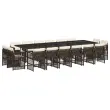 Ta vrtna jedilna garnitura je odlična izbira za večerjo na prostem ali za sprostitev na vrtu, dvorišču ali terasi. Vzdržljiv material: PE ratan, znan tudi kot poli ratan, je močan sintetični material, ki zahteva malo vzdrževanja in je videti kot naravni ratan. Je lahek, enostaven za čiščenje in se zaradi svoje vzdržljivosti in odpornosti na vremenske vplive pogosto uporablja za zunanje pohištvo.Kompaktno shranjevanje: Te stole je mogoče zložiti, zato jih je enostavno shraniti pod mizo. Ko so zloženi, se lepo prilegajo pod mizo in tvorijo prostorsko varčno kocko.Udobno sedenje: To zunanje pohištvo z debelo oblazinjenimi blazinami zagotavlja udobno sedenje.Prevleko je mogoče odstraniti in oprati: Te blazine imajo odstranljive prevleke za lažje pranje in vzdrževanje. Prevleke za blazine za stole imajo na zadnji strani zavihek za enostavno pritrditev na stole.Steklena mizna plošča: Površina zunanje mize je izdelana iz močnega in trpežnega kaljenega stekla, kar omogoča enostavno čiščenje z vlažno krpo in vašemu zunanjemu prostoru doda pridih elegance. Dobro je vedeti: Če želite, da vaše zunanje pohištvo ostane lepo, vam priporočamo, da ga zaščitite z vodoodporno prevleko.Maksimalna nosilnost (na sedež): 110 kgUV-odpornoPotrebno sestavljanje: DaMiza:Barva: Rjava in črnaMaterial: PE ratan, jeklo s prašnim premazom, kaljeno stekloDimenzije: 330 x 106 x 73 cm (D x Š x V)Stol:Barva: RjavaMaterial: PE ratan, jeklen okvir s prašnim premazomDimenzije: 50,5 x 54 x 79 cm (Š x G x V)Velikost sedišča: 45,5 x 38 cm (Š x G)Višina sedišča, merjena od tal: 43 cmVišina naslonjal za roke, merjena od tal: 63,5 cmBlazina:Barva: Kremno belaMaterial prevleke: Tkanina (100 % poliester)Material polnila: PenaDimenzije blazine za stol: 76 x 46 x 2 cm (D x Š x D)Paket vsebuje:1 x Vrtna miza16 x Vrtni stol16 x Blazina za stol z visokim naslonom s snemljivo in pralno prevleko 3211065