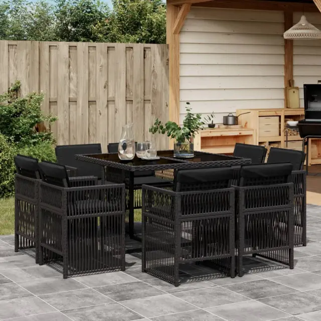vidaXL Vrtna jedilna garnitura 9-delna z blazinami črn poli ratan