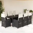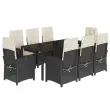 Ta vrtna jedilna garnitura je odlična izbira za večerjo na prostem ali za sprostitev na vrtu, dvorišču ali terasi. Vzdržljiv material: PE ratan, znan tudi kot poli ratan, je močan sintetični material, ki zahteva malo vzdrževanja in je videti kot naravni ratan. Je lahek, enostaven za čiščenje in se zaradi svoje vzdržljivosti in odpornosti na vremenske vplive pogosto uporablja za zunanje pohištvo.Nastavljivo naslonjalo: Ta vrtni sedež ima ročaj. S potegom ročaja lahko naslonjalo nastavite v poljuben položaj in ga hitro vrnete v prvotni položaj.Udobno sedenje: To zunanje pohištvo z debelo oblazinjenimi blazinami zagotavlja udobno sedenje.Prevleko je mogoče odstraniti in oprati: Te sedežne blazine imajo odstranljive prevleke za lažje pranje in vzdrževanje. Hrbtne blazine imajo na zadnji strani zavihek za enostavno pritrditev na naslonjala.Steklena mizna plošča: Površina zunanje mize je izdelana iz močnega in trpežnega kaljenega stekla, kar omogoča enostavno čiščenje z vlažno krpo in vašemu zunanjemu prostoru doda pridih elegance. Dobro je vedeti:Če želite, da vaše zunanje pohištvo ostane lepo, vam priporočamo, da ga zaščitite z vodoodporno prevleko.Maksimalna nosilnost (na sedež): 110 kgPlastične nastavljive nogeUV-odpornoPotrebno sestavljanje: DaStol:Barva: ČrnaMaterial: PE ratan, jeklen okvir s prašnim premazomDimenzije v sedečem položaju: 57 x 58,5 x 93 cm (Š x G x V)Dimenzije v ležečem položaju: 57 x 86 x 83 cm (Š x G x V)Velikost sedeža: 47 x 50 cm (Š x G)Višina sedeža, merjena od tal: 43,5 cmVišina naslonjala za roke, merjena od tal: 64 cmMiza:Barva: ČrnaMaterial: PE ratan, jeklo s prašnim premazom, kaljeno stekloDimenzije: 190 x 90 x 75 cm (Š x G x V)Blazina:Barva: Kremno belaMaterial prevleke: Tkanina (100 % poliester)Material polnila: PenaDimenzije sedežne blazine: 48 x 53 x 4 cm (Š x G x D)Dimenzije hrbtne blazine: 66,5 x 48 x 4 cm (D x Š x D)Paket vsebuje:8 x Vrtni stol s funkcijo nagiba1 x Miza8 x Blazina za hrbet8 x Sedežna blazina s snemljivo in pralno prevleko 3212201