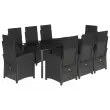 Ta vrtna jedilna garnitura je odlična izbira za večerjo na prostem ali za sprostitev na vrtu, dvorišču ali terasi. Vzdržljiv material: PE ratan, znan tudi kot poli ratan, je močan sintetični material, ki zahteva malo vzdrževanja in je videti kot naravni ratan. Je lahek, enostaven za čiščenje in se zaradi svoje vzdržljivosti in odpornosti na vremenske vplive pogosto uporablja za zunanje pohištvo.Nastavljivo naslonjalo: Ta vrtni sedež ima ročaj. S potegom ročaja lahko naslonjalo nastavite v poljuben položaj in ga hitro vrnete v prvotni položaj.Udobno sedenje: To zunanje pohištvo z debelo oblazinjenimi blazinami zagotavlja udobno sedenje.Prevleko je mogoče odstraniti in oprati: Te sedežne blazine imajo odstranljive prevleke za lažje pranje in vzdrževanje. Hrbtne blazine imajo na zadnji strani zavihek za enostavno pritrditev na naslonjala.Steklena mizna plošča: Površina zunanje mize je izdelana iz močnega in trpežnega kaljenega stekla, kar omogoča enostavno čiščenje z vlažno krpo in vašemu zunanjemu prostoru doda pridih elegance. Dobro je vedeti:Če želite, da vaše zunanje pohištvo ostane lepo, vam priporočamo, da ga zaščitite z vodoodporno prevleko.Maksimalna nosilnost (na sedež): 110 kgPlastične nastavljive nogeUV-odpornoPotrebno sestavljanje: DaStol:Barva: ČrnaMaterial: PE ratan, jeklen okvir s prašnim premazomDimenzije v sedečem položaju: 57 x 58,5 x 93 cm (Š x G x V)Dimenzije v ležečem položaju: 57 x 86 x 83 cm (Š x G x V)Velikost sedeža: 47 x 50 cm (Š x G)Višina sedeža, merjena od tal: 43,5 cmVišina naslonjala za roke, merjena od tal: 64 cmMiza:Barva: ČrnaMaterial: Jeklo s prašnim premazom, kaljeno stekloDimenzije: 200 x 100 x 74 cm (Š x G x V)Blazina:Barva: ČrnaMaterial prevleke: Tkanina (100 % poliester)Material polnila: PenaDimenzije sedežne blazine: 48 x 53 x 4 cm (Š x G x D)Dimenzije hrbtne blazine: 66,5 x 48 x 4 cm (D x Š x D)Paket vsebuje:8 x Vrtni stol s funkcijo nagiba1 x Miza8 x Blazina za hrbet8 x Sedežna blazina s snemljivo in pralno prevleko 3212328