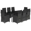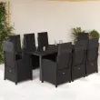 Ta vrtna jedilna garnitura je odlična izbira za večerjo na prostem ali za sprostitev na vrtu, dvorišču ali terasi. Vzdržljiv material: PE ratan, znan tudi kot poli ratan, je močan sintetični material, ki zahteva malo vzdrževanja in je videti kot naravni ratan. Je lahek, enostaven za čiščenje in se zaradi svoje vzdržljivosti in odpornosti na vremenske vplive pogosto uporablja za zunanje pohištvo.Nastavljivo naslonjalo: Ta vrtni sedež ima ročaj. S potegom ročaja lahko naslonjalo nastavite v poljuben položaj in ga hitro vrnete v prvotni položaj.Udobno sedenje: To zunanje pohištvo z debelo oblazinjenimi blazinami zagotavlja udobno sedenje.Prevleko je mogoče odstraniti in oprati: Te sedežne blazine imajo odstranljive prevleke za lažje pranje in vzdrževanje. Hrbtne blazine imajo na zadnji strani zavihek za enostavno pritrditev na naslonjala.Steklena mizna plošča: Površina zunanje mize je izdelana iz močnega in trpežnega kaljenega stekla, kar omogoča enostavno čiščenje z vlažno krpo in vašemu zunanjemu prostoru doda pridih elegance. Dobro je vedeti:Če želite, da vaše zunanje pohištvo ostane lepo, vam priporočamo, da ga zaščitite z vodoodporno prevleko.Maksimalna nosilnost (na sedež): 110 kgPlastične nastavljive nogeUV-odpornoPotrebno sestavljanje: DaVrtni naslanjač:Barva: ČrnaMaterial: PE ratan, jeklen okvir s prašnim premazomDimenzije v sedečem položaju: 57 x 58,5 x 93 cm (Š x G x V)Dimenzije v ležečem položaju: 57 x 86 x 83 cm (Š x G x V)Velikost sedeža: 47 x 50 cm (Š x G)Višina sedeža, merjena od tal: 43,5 cmVišina naslonjala za roke, merjena od tal: 64 cmNastavljiv vrtni stol z oporo za noge:Barva: ČrnaMaterial: PE ratan, jeklen okvir s prašnim premazomDimenzije v sedečem položaju: 57 x 60 x 93/110 cm (Š x G x V)Dimenzije v ležečem položaju: 57 x 113 x 83 cm (Š x G x V)Velikost sedeža: 47 x 50 cm (Š x G)Višina sedeža, merjena od tal: 43,5 cmVišina naslonjala za roke, merjena od tal: 64 cmMiza:Barva: ČrnaMaterial: Jeklo s prašnim premazom, kaljeno stekloDimenzije: 200 x 100 x 74 cm (Š x G x V)Blazina:Barva: ČrnaMaterial prevleke: Tkanina (100 % poliester)Material polnila: PenaDimenzije sedežne blazine: 48 x 53 x 4 cm (Š x G x D)Dimenzije hrbtne blazine: 66,5 x 48 x 4 cm (D x Š x D)Paket vsebuje:6 x Vrtni stol s funkcijo nagiba2 x Nastavljiv vrtni stol z oporo za noge1 x Miza8 x Blazina za hrbet8 x Sedežna blazina s snemljivo in pralno prevleko 3212329