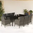 Ta vrtna jedilna garnitura je odlična izbira za večerjo na prostem ali za sprostitev na vrtu, dvorišču ali terasi. Vzdržljiv material: PE ratan, znan tudi kot poli ratan, je močan sintetični material, ki zahteva malo vzdrževanja in je videti kot naravni ratan. Je lahek, enostaven za čiščenje in se zaradi svoje vzdržljivosti in odpornosti na vremenske vplive pogosto uporablja za zunanje pohištvo.Udobno sedenje: To zunanje pohištvo z debelo oblazinjenimi blazinami zagotavlja udobno sedenje.Prevleko je mogoče odstraniti in oprati: Te sedežne blazine imajo odstranljive prevleke za lažje pranje in vzdrževanje.Steklena mizna plošča: Površina zunanje mize je izdelana iz močnega in trpežnega kaljenega stekla, kar omogoča enostavno čiščenje z vlažno krpo in vašemu zunanjemu prostoru doda pridih elegance.Robusten in stabilen okvir: Prašno barvan jekleni okvir zagotavlja, da je vrtno pohištvo močno in stabilno za vsakodnevno uporabo na prostem. Dobro je vedeti:Če želite, da vaše zunanje pohištvo ostane lepo, vam priporočamo, da ga zaščitite z vodoodporno prevleko.Maksimalna nosilnost (na sedež): 110 kgUV-odpornoPotrebno sestavljanje: DaMiza:Barva: ČrnaMaterial: PE ratan, jeklo s prašnim premazom, kaljeno stekloDimenzije: 200 x 100 x 74 cm (D x Š x V)Stol:Barva: SivaMaterial: PE ratan, jeklen okvir s prašnim premazomDimenzije: 58,5 x 67 x 86 cm (Š x G x V)Velikost sedeža: 48 x 51 cm (Š x G)Višina sedeža, merjena od tal: 42 cmVišina naslonjala za roke, merjena od tal: 63 cmBlazina:Barva: Temno sivaMaterial prevleke: Tkanina (100 % poliester)Polnilo sedežne blazine: PenaPolnilo hrbtne blazine: bombažna vlaknaDimenzije sedežne blazine: 49 x 51 x 3 cm (Š x G x D)Dimenzije hrbtne blazine: 50 x 50 x 11 cm (D x Š x D)Paket vsebuje:1 x Vrtna miza8 x Vrtni stol8 x Blazina za hrbet8 x Sedežna blazina s snemljivo in pralno prevleko 3211961