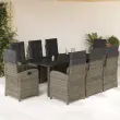 Ta vrtna jedilna garnitura je odlična izbira za večerjo na prostem ali za sprostitev na vrtu, dvorišču ali terasi. Vzdržljiv material: PE ratan, znan tudi kot poli ratan, je močan sintetični material, ki zahteva malo vzdrževanja in je videti kot naravni ratan. Je lahek, enostaven za čiščenje in se zaradi svoje vzdržljivosti in odpornosti na vremenske vplive pogosto uporablja za zunanje pohištvo.Nastavljivo naslonjalo: Ta vrtni sedež ima ročaj. S potegom ročaja lahko naslonjalo nastavite v poljuben položaj in ga hitro vrnete v prvotni položaj.Udobno sedenje: To zunanje pohištvo z debelo oblazinjenimi blazinami zagotavlja udobno sedenje.Prevleko je mogoče odstraniti in oprati: Te sedežne blazine imajo odstranljive prevleke za lažje pranje in vzdrževanje. Hrbtne blazine imajo na zadnji strani zavihek za enostavno pritrditev na naslonjala.Steklena mizna plošča: Površina zunanje mize je izdelana iz močnega in trpežnega kaljenega stekla, kar omogoča enostavno čiščenje z vlažno krpo in vašemu zunanjemu prostoru doda pridih elegance. Dobro je vedeti:Če želite, da vaše zunanje pohištvo ostane lepo, vam priporočamo, da ga zaščitite z vodoodporno prevleko.Maksimalna nosilnost (na sedež): 110 kgPlastične nastavljive nogeUV-odpornoPotrebno sestavljanje: DaVrtni naslanjač:Barva: SivaMaterial: PE ratan, jeklen okvir s prašnim premazomDimenzije v sedečem položaju: 57 x 58,5 x 93 cm (Š x G x V)Dimenzije v ležečem položaju: 57 x 86 x 83 cm (Š x G x V)Velikost sedeža: 47 x 50 cm (Š x G)Višina sedeža, merjena od tal: 43,5 cmVišina naslonjala za roke, merjena od tal: 64 cmNastavljiv vrtni stol z oporo za noge:Barva: SivaMaterial: PE ratan, jeklen okvir s prašnim premazomDimenzije v sedečem položaju: 57 x 60 x 93/110 cm (Š x G x V)Dimenzije v ležečem položaju: 57 x 113 x 83 cm (Š x G x V)Velikost sedeža: 47 x 50 cm (Š x G)Višina sedeža, merjena od tal: 43,5 cmVišina naslonjala za roke, merjena od tal: 64 cmMiza:Barva: ČrnaMaterial: Jeklo s prašnim premazom, kaljeno stekloDimenzije: 200 x 100 x 74 cm (Š x G x V)Blazina:Barva: Temno sivaMaterial prevleke: Tkanina (100 % poliester)Material polnila: PenaDimenzije sedežne blazine: 48 x 53 x 4 cm (Š x G x D)Dimenzije hrbtne blazine: 66,5 x 48 x 4 cm (D x Š x D)Paket vsebuje:6 x Vrtni stol s funkcijo nagiba2 x Nastavljiv vrtni stol z oporo za noge1 x Miza8 x Blazina za hrbet8 x Sedežna blazina s snemljivo in pralno prevleko 3212369
