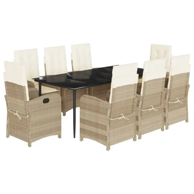 Ta vrtna jedilna garnitura je odlična izbira za večerjo na prostem ali za sprostitev na vrtu, dvorišču ali terasi. Vzdržljiv material: PE ratan, znan tudi kot poli ratan, je močan sintetični material, ki zahteva malo vzdrževanja in je videti kot naravni ratan. Je lahek, enostaven za čiščenje in se zaradi svoje vzdržljivosti in odpornosti na vremenske vplive pogosto uporablja za zunanje pohištvo.Nastavljivo naslonjalo: Ta vrtni sedež ima ročaj. S potegom ročaja lahko naslonjalo nastavite v poljuben položaj in ga hitro vrnete v prvotni položaj.Udobno sedenje: To zunanje pohištvo z debelo oblazinjenimi blazinami zagotavlja udobno sedenje.Prevleko je mogoče odstraniti in oprati: Te sedežne blazine imajo odstranljive prevleke za lažje pranje in vzdrževanje. Hrbtne blazine imajo na zadnji strani zavihek za enostavno pritrditev na naslonjala.Steklena mizna plošča: Površina zunanje mize je izdelana iz močnega in trpežnega kaljenega stekla, kar omogoča enostavno čiščenje z vlažno krpo in vašemu zunanjemu prostoru doda pridih elegance. Dobro je vedeti:Če želite, da vaše zunanje pohištvo ostane lepo, vam priporočamo, da ga zaščitite z vodoodporno prevleko.Maksimalna nosilnost (na sedež): 110 kgPlastične nastavljive nogeUV-odpornoPotrebno sestavljanje: DaStol:Barva: BežMaterial: PE ratan, jeklen okvir s prašnim premazomDimenzije v sedečem položaju: 57 x 58,5 x 93 cm (Š x G x V)Dimenzije v sedečem položaju (z naslonom za noge): 57 x 60 x 93/110 cm (Š x G x V)Dimenzije v ležečem položaju: 57 x 86 x 83 cm (Š x G x V)Dimenzije v ležečem položaju (z naslonom za noge): 57 x 113 x 83 cm (Š x G x V)Velikost sedeža: 47 x 50 cm (Š x G)Višina sedeža, merjena od tal: 43,5 cmVišina naslonjala za roke, merjena od tal: 64 cmMiza:Barva: ČrnaMaterial: Jeklo s prašnim premazom, kaljeno stekloDimenzije: 200 x 100 x 74 cm (Š x G x V)Blazina:Barva: Kremno belaMaterial prevleke: Tkanina (100 % poliester)Material polnila: PenaDimenzije sedežne blazine: 48 x 53 x 4 cm (Š x G x D)Dimenzije hrbtne blazine: 66,5 x 48 x 4 cm (D x Š x D)Paket vsebuje:6 x Vrtni stol s funkcijo nagiba2 x Nastavljiv vrtni stol z oporo za noge1 x Miza8 x Blazina za hrbet8 x Sedežna blazina s snemljivo in pralno prevleko 3212379
