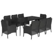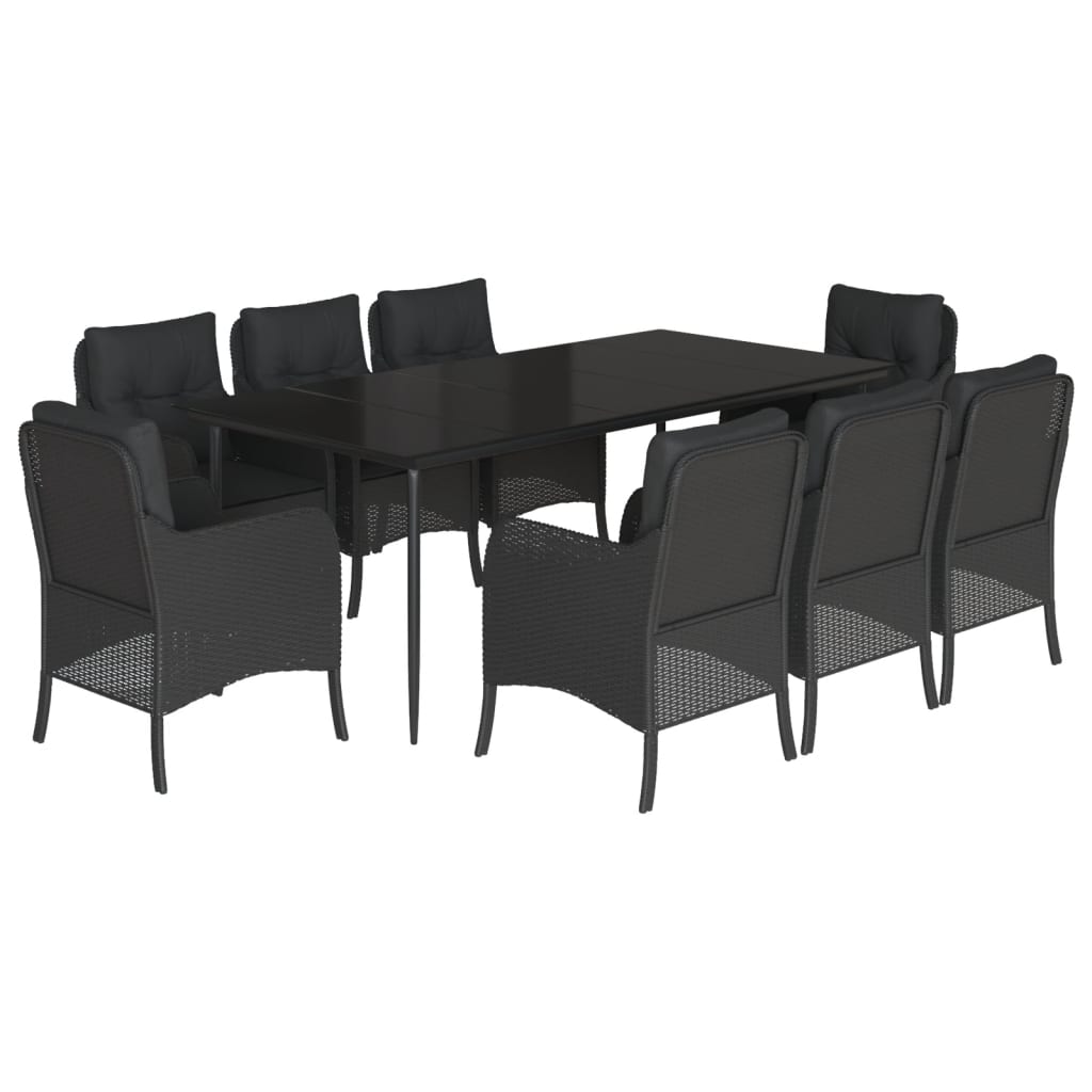 Ta vrtna jedilna garnitura je odlična izbira za večerjo na prostem ali za sprostitev na vrtu, dvorišču ali terasi. Vzdržljiv material: PE ratan, znan tudi kot poli ratan, je močan sintetični material, ki zahteva malo vzdrževanja in je videti kot naravni ratan. Je lahek, enostaven za čiščenje in se zaradi svoje vzdržljivosti in odpornosti na vremenske vplive pogosto uporablja za zunanje pohištvo.Udobno sedenje: To zunanje pohištvo z debelo oblazinjenimi blazinami zagotavlja udobno sedenje.Prevleko je mogoče odstraniti in oprati: Te sedežne blazine imajo odstranljive prevleke za lažje pranje in vzdrževanje.Steklena mizna plošča: Površina zunanje mize je izdelana iz močnega in trpežnega kaljenega stekla, kar omogoča enostavno čiščenje z vlažno krpo in vašemu zunanjemu prostoru doda pridih elegance.Robusten in stabilen okvir: Prašno barvan jekleni okvir zagotavlja, da je vrtno pohištvo močno in stabilno za vsakodnevno uporabo na prostem. Dobro je vedeti:Če želite, da vaše zunanje pohištvo ostane lepo, vam priporočamo, da ga zaščitite z vodoodporno prevleko.Maksimalna nosilnost (na sedež): 110 kgUV-odpornoPotrebno sestavljanje: DaMiza:Barva: ČrnaMaterial: PE ratan, jeklo s prašnim premazom, kaljeno stekloDimenzije: 200 x 100 x 74 cm (D x Š x V)Stol:Barva: ČrnaMaterial: PE ratan, jeklen okvir s prašnim premazomDimenzije: 58,5 x 67 x 86 cm (Š x G x V)Velikost sedeža: 48 x 51 cm (Š x G)Višina sedeža, merjena od tal: 42 cmVišina naslonjala za roke, merjena od tal: 63 cmBlazina:Barva: ČrnaMaterial prevleke: Tkanina (100 % poliester)Polnilo sedežne blazine: PenaPolnilo hrbtne blazine: bombažna vlaknaDimenzije sedežne blazine: 49 x 51 x 3 cm (Š x G x D)Dimenzije hrbtne blazine: 50 x 50 x 11 cm (D x Š x D)Paket vsebuje:1 x Vrtna miza8 x Vrtni stol8 x Blazina za hrbet8 x Sedežna blazina s snemljivo in pralno prevleko 3211926