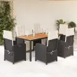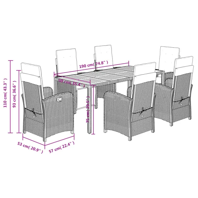 S to udobno vrtno jedilno garnituro lahko z družino ali prijatelji uživate v prijetni skodelici kave ali klepetu na vrtu, dvorišču ali balkonu! Vzdržljiv material: PE ratan, znan tudi kot poli ratan, je močan sintetični material, ki zahteva malo vzdrževanja in je videti kot naravni ratan. Je lahek, enostaven za čiščenje in se zaradi svoje vzdržljivosti in odpornosti na vremenske vplive pogosto uporablja za zunanje pohištvo.Nastavljivo naslonjalo za hrbet in podnožje: Ta vrtni sedež ima ročaj. Naslonjalo za hrbet in naslonjalo za noge lahko s potegom ročaja nastavite v poljuben položaj in ju hitro vrnete v prvotni položaj.Udobno sedenje: To zunanje pohištvo z debelo oblazinjenimi blazinami zagotavlja udobno sedenje.Prevleko je mogoče odstraniti in oprati: Te sedežne blazine imajo odstranljive prevleke za lažje pranje in vzdrževanje. Hrbtne blazine imajo na zadnji strani zavihek za enostavno pritrditev na naslonjala. Stabilna mizna plošča, ki je enostavna za čiščenje: Ta vrtna miza ima ploščo iz akacijevega lesa, ki je čvrsta, vzdržljiva in jo je enostavno čistiti z vlažno krpo. Dobro je vedeti:Če želite, da vaše zunanje pohištvo ostane lepo, vam priporočamo, da ga zaščitite z vodoodporno prevleko.Stol:Barva: ČrnaMaterial: PE ratan, jeklen okvir s prašnim premazomDimenzije v sedečem položaju: 57 x 60 x 93/110 cm (Š x G x V)Dimenzije v ležečem položaju: 57 x 113 x 83 cm (Š x G x V)Velikost sedeža: 47 x 50 cm (Š x G)Višina sedeža, merjena od tal: 43,5 cmVišina naslonjal za roke, merjena od tal: 64,5 cmMaksimalna nosilnost (na sedež): 110 kgPlastične nastavljive nogeUV-odpornoPotrebno sestavljanje: DaMiza:Barva mizice: ČrnaMaterial: PE ratan, jeklo s prašnim premazom, trden akacijev lesDimenzije: 190 x 90 x 75 cm (D x Š x V)Blazina:Barva: Kremno belaMaterial prevleke: Tkanina (100 % poliester)Material polnila: PenaDimenzije sedežne blazine: 84 x 48 x 4 cm (Š x G x D)Dimenzije hrbtne blazine: 65 x 48 x 4 cm (D x Š x D)Paket vsebuje:6 x Vrtni stol s funkcijo nagiba1 x Miza6 x Blazina za hrbet6 x Sedežna blazina s snemljivo pralno prevleko 3212472