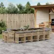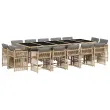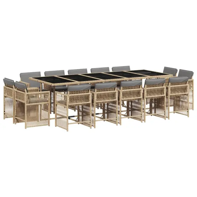 Ta vrtna jedilna garnitura je odlična izbira za večerjo na prostem ali za sprostitev na vrtu, dvorišču ali terasi. Vzdržljiv material: PE ratan, znan tudi kot poli ratan, je močan sintetični material, ki zahteva malo vzdrževanja in je videti kot naravni ratan. Je lahek, enostaven za čiščenje in se zaradi svoje vzdržljivosti in odpornosti na vremenske vplive pogosto uporablja za zunanje pohištvo.Kompaktno shranjevanje: Te stole je mogoče zložiti, zato jih je enostavno shraniti pod mizo. Ko so zloženi, se lepo prilegajo pod mizo in tvorijo prostorsko varčno kocko.Udobno sedenje: To zunanje pohištvo z debelo oblazinjenimi blazinami zagotavlja udobno sedenje.Prevleko je mogoče odstraniti in oprati: Te sedežne blazine imajo odstranljive prevleke za lažje pranje in vzdrževanje. Prevleke za blazine imajo na zadnji strani zavihek za enostavno pritrditev na naslonjala.Steklena mizna plošča: Površina zunanje mize je izdelana iz močnega in trpežnega kaljenega stekla, kar omogoča enostavno čiščenje z vlažno krpo in vašemu zunanjemu prostoru doda pridih elegance. Dobro je vedeti:Če želite, da vaše zunanje pohištvo ostane lepo, vam priporočamo, da ga zaščitite z vodoodporno prevleko.Maksimalna nosilnost (na sedež): 110 kgUV-odpornoPotrebno sestavljanje: DaMiza:Barva: Mešano bežMaterial: PE ratan, jeklo s prašnim premazom, kaljeno stekloDimenzije: 275 x 106 x 73 cm (D x Š x V)Stol:Barva: Mešano bežMaterial: PE ratan, jeklen okvir s prašnim premazomDimenzije: 50,5 x 54 x 79 cm (Š x G x V)Velikost sedišča: 45,5 x 38 cm (Š x G)Višina sedišča, merjena od tal: 43 cmVišina naslonjal za roke, merjena od tal: 63,5 cmBlazina:Barva: Svetlo sivaMaterial prevleke: Tkanina (100 % poliester)Polnilo sedežne blazine: PenaDimenzije sedežne blazine: 76 x 46 x 2 cm (D x Š x D)Paket vsebuje:1 x Vrtna miza14 x Vrtni stol14 x Blazina za stol z visokim naslonom s snemljivo in pralno prevleko 3211776