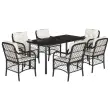 Ta vrtna jedilna garnitura je odlična izbira za večerjo na prostem ali za sprostitev na vrtu, dvorišču ali terasi. Vzdržljiv material: PE ratan, znan tudi kot poli ratan, je močan sintetični material, ki zahteva malo vzdrževanja in je videti kot naravni ratan. Je lahek, enostaven za čiščenje in se zaradi svoje vzdržljivosti in odpornosti na vremenske vplive pogosto uporablja za zunanje pohištvo.Udobno sedenje: To zunanje pohištvo z debelo oblazinjenimi blazinami zagotavlja udobno sedenje.Prevleko je mogoče odstraniti in oprati: Te sedežne blazine imajo odstranljive prevleke za lažje pranje in vzdrževanje.Steklena mizna plošča: Površina zunanje mize je izdelana iz močnega in trpežnega kaljenega stekla, kar omogoča enostavno čiščenje z vlažno krpo in vašemu zunanjemu prostoru doda pridih elegance.Robusten in stabilen okvir: Prašno premazan jeklen okvir zagotavlja, da je vrtno pohištvo močno in stabilno za vsakodnevno uporabo na prostem. Dobro je vedeti:Če želite, da vaše zunanje pohištvo ostane lepo, vam priporočamo, da ga zaščitite z vodoodporno prevleko.UV-odpornoPotrebno sestavljanje: DaMiza:Barva: ČrnaMaterial: Jeklo s prašnim premazom, kaljeno stekloDimenzije mize: 160 x 80 x 74 cm (D x Š x V)Stol:Barva: ČrnaMaterial: PE ratan, jeklen okvir s prašnim premazomDimenzije: 58,5 x 67 x 86 cm (Š x G x V)Velikost sedeža: 48 x 51 cm (Š x G)Višina sedeža od tal (brez blazine): 42 cmVišina naslonjala za roke, merjena od tal: 63 cmMaksimalna nosilnost (na sedež): 110 kgSedežna blazina:Barva: Kremno belaMaterial prevleke: Tkanina (100 % poliester)Polnilo sedežne blazine: PenaPolnilo hrbtne blazine: bombažna vlaknaDimenzije sedežne blazine: 49 x 51 x 3 cm (Š x G x D)Dimenzije hrbtne blazine: 50 x 50 x 11 cm (Š x G x D)Paket vsebuje:1 x Miza6 x Stol6 x Blazina za hrbet6 x Sedežna blazina s snemljivo pralno prevleko 3212093