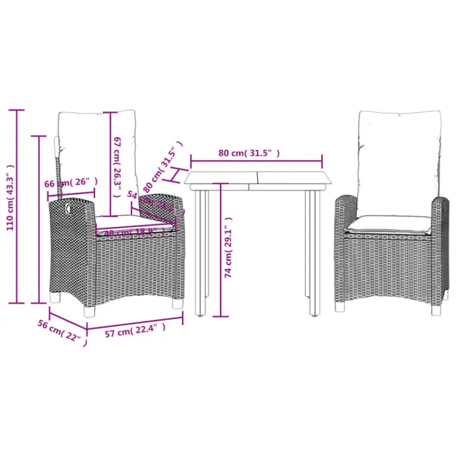 Ta vrtna jedilna garnitura je odlična izbira za večerjo na prostem ali za sprostitev na vrtu, dvorišču ali terasi. Vzdržljiv material: PE ratan, znan tudi kot poli ratan, je močan sintetični material, ki zahteva malo vzdrževanja in je videti kot naravni ratan. Je lahek, enostaven za čiščenje in se zaradi svoje vzdržljivosti in odpornosti na vremenske vplive pogosto uporablja za zunanje pohištvo. Nastavljivo naslonjalo: Ta vrtni sedež ima ročaj. S potegom ročaja lahko naslonjalo nastavite v poljuben položaj in ga hitro vrnete v prvotni položaj.Steklena mizna plošča: Površina zunanje mize je izdelana iz močnega in trpežnega kaljenega stekla, kar omogoča enostavno čiščenje z vlažno krpo in vašemu zunanjemu prostoru doda pridih elegance. Udobno sedenje: To zunanje pohištvo z debelo oblazinjenimi blazinami zagotavlja udobno sedenje. Prevleko je mogoče odstraniti in oprati: Te sedežne blazine imajo odstranljive prevleke za lažje pranje in vzdrževanje. Dobro je vedeti:Če želite, da vaše zunanje pohištvo ostane lepo, vam priporočamo, da ga zaščitite z vodoodporno prevleko.Maksimalna nosilnost (na sedež): 110 kgUV-odpornoPotrebno sestavljanje: DaVrtna miza:Barva: ČrnaMaterial: Jeklo s prašnim premazom, kaljeno stekloDimenzije mize: 80 x 80 x 74 cm (D x Š x V)Vrtni naslanjač:Barva: Mešano bežMaterial: PE ratan, jeklen okvir s prašnim premazomDimenzije v sedečem položaju: 57 x 66 x 93 cm (Š x G x V)Dimenzije v ležečem položaju: 57 x 90 x 83 cm (Š x G x V)Velikost sedeža: 48 x 54 cm (Š x G)Višina sedeža, merjena od tal: 43,5 cmVišina naslonjala za roke, merjena od tal: 62 cmBlazina:Barva: Svetlo sivaMaterial prevleke: Tkanina (100 % poliester)Polnilo sedežne blazine: PenaPolnilo hrbtne blazine: bombažna vlaknaDimenzije sedežne blazine: 48 x 54 x 3 cm (Š x G x D)Dimenzije hrbtne blazine: 67 x 48 x 10 cm (D x Š x D)Paket vsebuje:1 x Vrtna miza2 x Vrtni stol s funkcijo nagiba2 x Blazina za hrbet2 x Sedežna blazina s snemljivo pralno prevleko 3212832