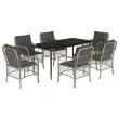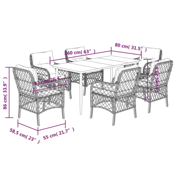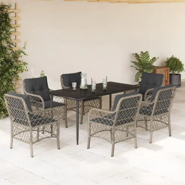 Ta vrtna jedilna garnitura je odlična izbira za večerjo na prostem ali za sprostitev na vrtu, dvorišču ali terasi. Vzdržljiv material: PE ratan, znan tudi kot poli ratan, je močan sintetični material, ki zahteva malo vzdrževanja in je videti kot naravni ratan. Je lahek, enostaven za čiščenje in se zaradi svoje vzdržljivosti in odpornosti na vremenske vplive pogosto uporablja za zunanje pohištvo.Udobno sedenje: To zunanje pohištvo z debelo oblazinjenimi blazinami zagotavlja udobno sedenje.Prevleko je mogoče odstraniti in oprati: Te sedežne blazine imajo odstranljive prevleke za lažje pranje in vzdrževanje.Steklena mizna plošča: Površina zunanje mize je izdelana iz močnega in trpežnega kaljenega stekla, kar omogoča enostavno čiščenje z vlažno krpo in vašemu zunanjemu prostoru doda pridih elegance.Robusten in stabilen okvir: Prašno premazan jeklen okvir zagotavlja, da je vrtno pohištvo močno in stabilno za vsakodnevno uporabo na prostem. Dobro je vedeti:Če želite, da vaše zunanje pohištvo ostane lepo, vam priporočamo, da ga zaščitite z vodoodporno prevleko.UV-odpornoPotrebno sestavljanje: DaMiza:Barva: ČrnaMaterial: Jeklo s prašnim premazom, kaljeno stekloDimenzije mize: 160 x 80 x 74 cm (D x Š x V)Stol:Barva: Svetlo sivaMaterial: PE ratan, jeklen okvir s prašnim premazomDimenzije: 58,5 x 67 x 86 cm (Š x G x V)Velikost sedeža: 48 x 51 cm (Š x G)Višina sedeža od tal (brez blazine): 42 cmVišina naslonjala za roke, merjena od tal: 63 cmMaksimalna nosilnost (na sedež): 110 kgSedežna blazina:Barva: AntracitnaMaterial prevleke: Tkanina (100 % poliester)Polnilo sedežne blazine: PenaPolnilo hrbtne blazine: bombažna vlaknaDimenzije sedežne blazine: 49 x 51 x 3 cm (Š x G x D)Dimenzije hrbtne blazine: 50 x 50 x 11 cm (Š x G x D)Paket vsebuje:1 x Miza6 x Stol6 x Blazina za hrbet6 x Sedežna blazina s snemljivo pralno prevleko 3212170