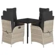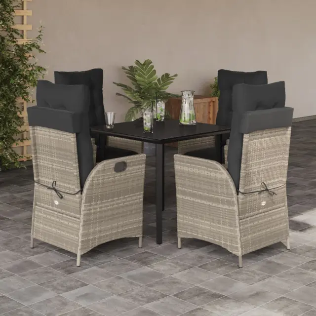 Ta vrtna jedilna garnitura je odlična izbira za večerjo na prostem ali za sprostitev na vrtu, dvorišču ali terasi. Vzdržljiv material: PE ratan, znan tudi kot poli ratan, je močan sintetični material, ki zahteva malo vzdrževanja in je videti kot naravni ratan. Je lahek, enostaven za čiščenje in se zaradi svoje vzdržljivosti in odpornosti na vremenske vplive pogosto uporablja za zunanje pohištvo.Nastavljivo naslonjalo: Ta vrtni sedež ima ročaj. S potegom ročaja lahko naslonjalo nastavite v poljuben položaj in ga hitro vrnete v prvotni položaj.Udobno sedenje: To zunanje pohištvo z debelo oblazinjenimi blazinami zagotavlja udobno sedenje.Prevleko je mogoče odstraniti in oprati: Te sedežne blazine imajo odstranljive prevleke za lažje pranje in vzdrževanje. Hrbtne blazine imajo na zadnji strani zavihek za enostavno pritrditev na naslonjala.Steklena mizna plošča: Površina zunanje mize je izdelana iz močnega in trpežnega kaljenega stekla, kar omogoča enostavno čiščenje z vlažno krpo in vašemu zunanjemu prostoru doda pridih elegance. Dobro je vedeti: Če želite, da vaše zunanje pohištvo ostane lepo, vam priporočamo, da ga zaščitite z vodoodporno prevleko.Maksimalna nosilnost (na sedež): 110 kgUV-odpornoPotrebno sestavljanje: DaMiza:Barva: ČrnaMaterial: Jeklo s prašnim premazom, kaljeno stekloDimenzije mize: 80 x 80 x 74 cm (D x Š x V)Vrtni naslanjač:Barva: Svetlo sivaMaterial: PE ratan, jeklen okvir s prašnim premazomDimenzije v sedečem položaju: 57 x 61 x 93 cm (Š x G x V)Dimenzije v ležečem položaju: 57 x 86 x 83 cm (Š x G x V)Velikost sedeža: 47 x 50 cm (Š x G)Višina sedeža od tal: 44 cmVišina naslonjala za roke, merjena od tal: 64 cmBlazina:Barva: AntracitnaMaterial prevleke: Tkanina (100 % poliester)Polnilo sedežne blazine: PenaPolnilo hrbtne blazine: bombažna vlaknaDimenzije sedežne blazine: 48 x 51 x 3 cm (Š x G x D)Dimenzije hrbtne blazine: 66 x 48 x 11 cm (D x Š x D)Paket vsebuje:1 x Vrtna miza4 x Vrtni stol s funkcijo nagiba4 x Blazina za hrbet4 x Sedežna blazina s snemljivo in pralno prevleko 3213285