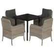 Ta vrtna jedilna garnitura je odlična izbira za večerjo na prostem ali za sprostitev na vrtu, dvorišču ali terasi. Vzdržljiv material: PE ratan, znan tudi kot poli ratan, je močan sintetični material, ki zahteva malo vzdrževanja in je videti kot naravni ratan. Je lahek, enostaven za čiščenje in se zaradi svoje vzdržljivosti in odpornosti na vremenske vplive pogosto uporablja za zunanje pohištvo.Udobno sedenje: To zunanje pohištvo z debelo oblazinjenimi blazinami zagotavlja udobno sedenje.Prevleko je mogoče odstraniti in oprati: Te sedežne blazine imajo odstranljive prevleke za lažje pranje in vzdrževanje.Steklena mizna plošča: Površina zunanje mize je izdelana iz močnega in trpežnega kaljenega stekla, kar omogoča enostavno čiščenje z vlažno krpo in vašemu zunanjemu prostoru doda pridih elegance.Robusten in stabilen okvir: Prašno barvan jekleni okvir zagotavlja, da je vrtno pohištvo močno in stabilno za vsakodnevno uporabo na prostem. Dobro je vedeti:Če želite, da vaše zunanje pohištvo ostane lepo, vam priporočamo, da ga zaščitite z vodoodporno prevleko.Maksimalna nosilnost (na sedež): 110 kgUV-odpornoPotrebno sestavljanje: DaMiza:Barva: ČrnaMaterial: PE ratan, jeklo s prašnim premazom, kaljeno stekloDimenzije mize: 80 x 80 x 74 cm (D x Š x V)Stol:Barva: Svetlo sivaMaterial: PE ratan, jeklen okvir s prašnim premazomDimenzije: 58,5 x 67 x 86 cm (Š x G x V)Velikost sedeža: 48 x 51 cm (Š x G)Višina sedeža, merjena od tal: 42 cmVišina naslonjala za roke, merjena od tal: 63 cmBlazina:Barva: AntracitnaMaterial prevleke: Tkanina (100 % poliester)Polnilo sedežne blazine: PenaPolnilo hrbtne blazine: bombažna vlaknaDimenzije sedežne blazine: 49 x 51 x 3 cm (Š x G x D)Dimenzije hrbtne blazine: 50 x 50 x 11 cm (D x Š x D)Paket vsebuje:1 x Vrtna miza4 x Vrtni stol4 x Blazina za hrbet4 x Sedežna blazina s snemljivo in pralno prevleko 3211998