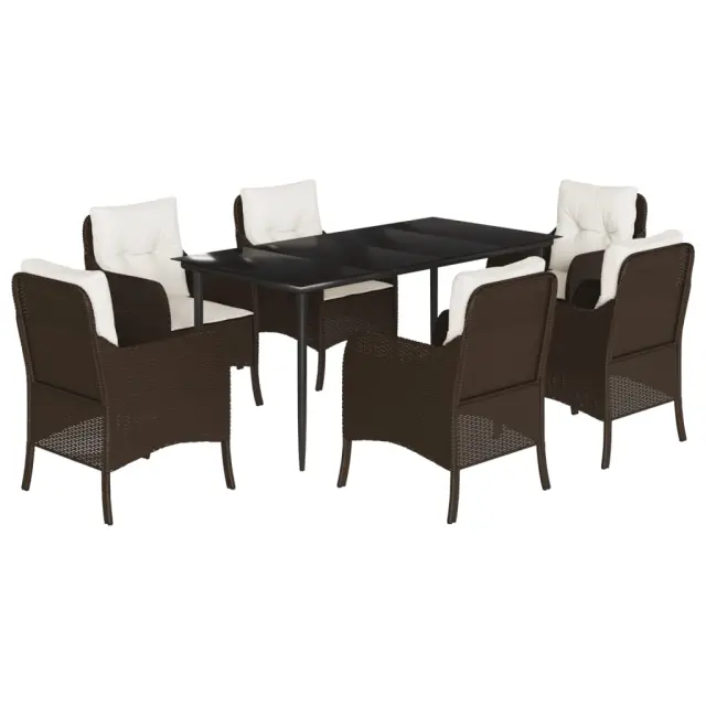 Ta vrtna jedilna garnitura je odlična izbira za večerjo na prostem ali za sprostitev na vrtu, dvorišču ali terasi. Vzdržljiv material: PE ratan, znan tudi kot poli ratan, je močan sintetični material, ki zahteva malo vzdrževanja in je videti kot naravni ratan. Je lahek, enostaven za čiščenje in se zaradi svoje vzdržljivosti in odpornosti na vremenske vplive pogosto uporablja za zunanje pohištvo.Udobno sedenje: To zunanje pohištvo z debelo oblazinjenimi blazinami zagotavlja udobno sedenje.Prevleko je mogoče odstraniti in oprati: Te sedežne blazine imajo odstranljive prevleke za lažje pranje in vzdrževanje.Steklena mizna plošča: Površina zunanje mize je izdelana iz močnega in trpežnega kaljenega stekla, kar omogoča enostavno čiščenje z vlažno krpo in vašemu zunanjemu prostoru doda pridih elegance.Robusten in stabilen okvir: Prašno barvan jekleni okvir zagotavlja, da je vrtno pohištvo močno in stabilno za vsakodnevno uporabo na prostem. Dobro je vedeti:Če želite, da vaše zunanje pohištvo ostane lepo, vam priporočamo, da ga zaščitite z vodoodporno prevleko.Maksimalna nosilnost (na sedež): 110 kgUV-odpornoPotrebno sestavljanje: DaMiza:Barva: ČrnaMaterial: PE ratan, jeklo s prašnim premazom, kaljeno stekloDimenzije mize: 160 x 80 x 74 cm (D x Š x V)Stol:Barva: RjavaMaterial: PE ratan, jeklen okvir s prašnim premazomDimenzije: 58,5 x 67 x 86 cm (Š x G x V)Velikost sedeža: 48 x 51 cm (Š x G)Višina sedeža, merjena od tal: 42 cmVišina naslonjala za roke, merjena od tal: 63 cmBlazina:Barva: Kremno belaMaterial prevleke: Tkanina (100 % poliester)Polnilo sedežne blazine: PenaPolnilo hrbtne blazine: bombažna vlaknaDimenzije sedežne blazine: 49 x 51 x 3 cm (Š x G x D)Dimenzije hrbtne blazine: 50 x 50 x 11 cm (D x Š x D)Paket vsebuje:1 x Vrtna miza6 x Vrtni stol6 x Blazina za hrbet6 x Sedežna blazina s snemljivo pralno prevleko 3211938
