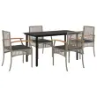 Ta vrtna jedilna garnitura je odlična izbira za večerjo na prostem ali za sprostitev na vrtu, dvorišču ali terasi. Vzdržljiv material: PE ratan, znan tudi kot poli ratan, je močan sintetični material, ki zahteva malo vzdrževanja in je videti kot naravni ratan. Je lahek, enostaven za čiščenje in se zaradi svoje vzdržljivosti in odpornosti na vremenske vplive pogosto uporablja za zunanje pohištvo.Udobno sedenje: To zunanje pohištvo z debelo oblazinjenimi blazinami zagotavlja udobno sedenje.Prevleko je mogoče odstraniti in oprati: Te sedežne blazine imajo odstranljive prevleke za lažje pranje in vzdrževanje.Steklena mizna plošča: Površina zunanje mize je izdelana iz močnega in trpežnega kaljenega stekla, kar omogoča enostavno čiščenje z vlažno krpo in vašemu zunanjemu prostoru doda pridih elegance.Robusten in stabilen okvir: Prašno barvan jekleni okvir zagotavlja, da je vrtno pohištvo močno in stabilno za vsakodnevno uporabo na prostem. Dobro je vedeti:Če želite, da vaše zunanje pohištvo ostane lepo, vam priporočamo, da ga zaščitite z vodoodporno prevleko.Maksimalna nosilnost (na sedež): 110 kgUV-odpornoPotrebno sestavljanje: DaMiza:Barva: ČrnaMaterial: Jeklo s prašnim premazom, kaljeno stekloDimenzije: 140 x 70 x 74 cm (D x Š x V)Stol:Barva: SivaMaterial: PE ratan, prašno premazano jeklo, trden akacijev les z oljnim premazomDimenzije: 54 x 57 x 85 cm (Š x G x V)Velikost sedeža: 46,5 x 49 cm (Š x G)Višina sedeža, merjena od tal: 42,5 cmVišina naslonjala za roke, merjena od tal: 59,5 cmBlazina:Barva: Temno sivaMaterial prevleke: Tkanina (100 % poliester)Material polnila: PenaDimenzije blazine za stol: 46 x 48 x 3 cm (Š x G x D)Paket vsebuje:1 x Vrtna miza4 x Vrtni stol4 x Sedežna blazina s snemljivo in pralno prevleko 3213619