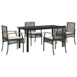 Ta vrtna jedilna garnitura je odlična izbira za večerjo na prostem ali za sprostitev na vrtu, dvorišču ali terasi. Vzdržljiv material: PE ratan, znan tudi kot poli ratan, je močan sintetični material, ki zahteva malo vzdrževanja in je videti kot naravni ratan. Je lahek, enostaven za čiščenje in se zaradi svoje vzdržljivosti in odpornosti na vremenske vplive pogosto uporablja za zunanje pohištvo.Udobno sedenje: To zunanje pohištvo z debelo oblazinjenimi blazinami zagotavlja udobno sedenje.Prevleko je mogoče odstraniti in oprati: Te sedežne blazine imajo odstranljive prevleke za lažje pranje in vzdrževanje.Steklena mizna plošča: Površina zunanje mize je izdelana iz močnega in trpežnega kaljenega stekla, kar omogoča enostavno čiščenje z vlažno krpo in vašemu zunanjemu prostoru doda pridih elegance.Robusten in stabilen okvir: Prašno barvan jekleni okvir zagotavlja, da je vrtno pohištvo močno in stabilno za vsakodnevno uporabo na prostem. Dobro je vedeti:Če želite, da vaše zunanje pohištvo ostane lepo, vam priporočamo, da ga zaščitite z vodoodporno prevleko.Maksimalna nosilnost (na sedež): 110 kgUV-odpornoPotrebno sestavljanje: DaMiza:Barva: ČrnaMaterial: Jeklo s prašnim premazom, kaljeno stekloDimenzije mize: 160 x 80 x 74 cm (D x Š x V)Stol:Barva: ČrnaMaterial: PE ratan, prašno premazano jeklo, trden akacijev les z oljnim premazomDimenzije: 54 x 57 x 85 cm (Š x G x V)Velikost sedeža: 46,5 x 49 cm (Š x G)Višina sedeža, merjena od tal: 42,5 cmVišina naslonjala za roke, merjena od tal: 59,5 cmBlazina:Barva: Kremno belaMaterial prevleke: Tkanina (100 % poliester)Material polnila: PenaDimenzije blazine za stol: 46 x 48 x 3 cm (Š x G x D)Paket vsebuje:1 x Vrtna miza4 x Vrtni stol4 x Sedežna blazina s snemljivo in pralno prevleko 3213606