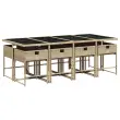 Ta vrtna jedilna garnitura je odlična izbira za večerjo na prostem ali za sprostitev na vrtu, dvorišču ali terasi. Vzdržljiv material: PE ratan, znan tudi kot poli ratan, je močan sintetični material, ki zahteva malo vzdrževanja in je videti kot naravni ratan. Je lahek, enostaven za čiščenje in se zaradi svoje vzdržljivosti in odpornosti na vremenske vplive pogosto uporablja za zunanje pohištvo.Kompaktno shranjevanje: Te stole je mogoče zložiti, zato jih je enostavno shraniti pod mizo. Ko so zloženi, se lepo prilegajo pod mizo in tvorijo prostorsko varčno kocko.Udobno sedenje: To zunanje pohištvo z debelo oblazinjenimi blazinami zagotavlja udobno sedenje.Prevleko je mogoče odstraniti in oprati: Te sedežne blazine imajo odstranljive prevleke za lažje pranje in vzdrževanje. Prevleke za blazine imajo na zadnji strani zavihek za enostavno pritrditev na naslonjala.Steklena mizna plošča: Površina zunanje mize je izdelana iz močnega in trpežnega kaljenega stekla, kar omogoča enostavno čiščenje z vlažno krpo in vašemu zunanjemu prostoru doda pridih elegance. Dobro je vedeti:Če želite, da vaše zunanje pohištvo ostane lepo, vam priporočamo, da ga zaščitite z vodoodporno prevleko.Maksimalna nosilnost (na sedež): 110 kgUV-odpornoPotrebno sestavljanje: DaMiza:Barva mize: Mešano bežBarva stekla: ČrnaMaterial: PE ratan, jeklo s prašnim premazom, kaljeno stekloDimenzije: 220 x 106 x 73 cm (D x Š x V)Stol:Barva: Mešano bežMaterial: PE ratan, jeklen okvir s prašnim premazomDimenzije: 50,5 x 50 x 79 cm (Š x G x V)Velikost sedišča: 45,5 x 38 cm (Š x G)Višina sedišča, merjena od tal: 43 cmVišina naslonjal za roke, merjena od tal: 63,5 cmBlazina:Barva: Svetlo sivaMaterial prevleke: Tkanina (100 % poliester)Material polnila: PenaDimenzije blazine za stol: 76 x 45,5 x 2 cm (D x Š x D)Paket vsebuje:1 x Vrtna miza8 x Vrtni stol8 x Blazina za stol z visokim naslonom s snemljivo in pralno prevleko 3211284