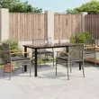 Ta vrtna jedilna garnitura je odlična izbira za večerjo na prostem ali za sprostitev na vrtu, dvorišču ali terasi. Vzdržljiv material: PE ratan, znan tudi kot poli ratan, je močan sintetični material, ki zahteva malo vzdrževanja in je videti kot naravni ratan. Je lahek, enostaven za čiščenje in se zaradi svoje vzdržljivosti in odpornosti na vremenske vplive pogosto uporablja za zunanje pohištvo.Udobno sedenje: To zunanje pohištvo z debelo oblazinjenimi blazinami zagotavlja udobno sedenje.Prevleko je mogoče odstraniti in oprati: Te sedežne blazine imajo odstranljive prevleke za lažje pranje in vzdrževanje.Steklena mizna plošča: Površina zunanje mize je izdelana iz močnega in trpežnega kaljenega stekla, kar omogoča enostavno čiščenje z vlažno krpo in vašemu zunanjemu prostoru doda pridih elegance.Robusten in stabilen okvir: Prašno barvan jekleni okvir zagotavlja, da je vrtno pohištvo močno in stabilno za vsakodnevno uporabo na prostem. Dobro je vedeti:Če želite, da vaše zunanje pohištvo ostane lepo, vam priporočamo, da ga zaščitite z vodoodporno prevleko.Maksimalna nosilnost (na sedež): 110 kgUV-odpornoPotrebno sestavljanje: DaMiza:Barva: ČrnaMaterial: Jeklo s prašnim premazom, kaljeno stekloDimenzije mize: 160 x 80 x 74 cm (D x Š x V)Stol:Barva: SivaMaterial: PE ratan, prašno premazano jeklo, trden akacijev les z oljnim premazomDimenzije: 54 x 57 x 85 cm (Š x G x V)Velikost sedeža: 46,5 x 49 cm (Š x G)Višina sedeža, merjena od tal: 42,5 cmVišina naslonjala za roke, merjena od tal: 59,5 cmBlazina:Barva: Temno sivaMaterial prevleke: Tkanina (100 % poliester)Material polnila: PenaDimenzije blazine za stol: 46 x 48 x 3 cm (Š x G x D)Paket vsebuje:1 x Vrtna miza4 x Vrtni stol4 x Sedežna blazina s snemljivo in pralno prevleko 3213620