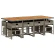 Ta vrtna jedilna garnitura je odlična izbira za večerjo na prostem ali za sprostitev na vrtu, dvorišču ali terasi. Vzdržljiv material: PE ratan, znan tudi kot poli ratan, je močan sintetični material, ki zahteva malo vzdrževanja in je videti kot naravni ratan. Je lahek, enostaven za čiščenje in se zaradi svoje vzdržljivosti in odpornosti na vremenske vplive pogosto uporablja za zunanje pohištvo.Kompaktno shranjevanje: Te stole je mogoče zložiti, zato jih je enostavno shraniti pod mizo. Ko so zloženi, se lepo prilegajo pod mizo in tvorijo prostorsko varčno kocko. Poleg tega je mogoče stolčke shraniti tudi pod stole, kar še poveča prostorsko učinkovitost.Udobno sedenje: To zunanje pohištvo z debelo oblazinjenimi blazinami zagotavlja udobno sedenje.Prevleko je mogoče odstraniti in oprati: Te sedežne blazine imajo odstranljive prevleke za lažje pranje in vzdrževanje. Prevleke za blazine imajo na zadnji strani zavihek za enostavno pritrditev na naslonjala.Stabilna mizna plošča, ki je enostavna za čiščenje: Ta vrtna miza ima ploščo iz akacijevega lesa, ki je čvrsta, vzdržljiva in jo je enostavno čistiti z vlažno krpo. Dobro je vedeti: Če želite, da vaše zunanje pohištvo ostane lepo, vam priporočamo, da ga zaščitite z vodoodporno prevleko.Maksimalna nosilnost (na sedež): 110 kg UV-odporno Potrebno sestavljanje: Da Miza: Barva mize: Siva in rjavaMaterial: PE ratan, jeklo s prašnim premazom, trden akacijev lesDimenzije: 220 x 106 x 73 cm (D x Š x V) Stol: Barva: Siva Material: PE ratan, jeklen okvir s prašnim premazom Dimenzije: 50,5 x 50 x 79 cm (Š x G x V) Velikost sedišča: 45,5 x 38 cm (Š x G) Višina sedišča, merjena od tal: 43 cm Višina naslonjal za roke, merjena od tal: 63,5 cm Stolček: Barva: Siva Material: PE ratan, jeklen okvir s prašnim premazom Dimenzije: 41 x 41 x 36 cm (Š x G x V) Blazina: Barva: Temno siva Material prevleke: Tkanina (100 % poliester) Material polnila: Pena Dimenzije blazine za stol: 76 x 46 x 2 cm (D x Š x D)Dimenzije blazine za stolček: 40 x 40 x 2 cm (Š x G x D) Paket vsebuje:1 x Vrtna miza 8 x Vrtni stol 4 x Vrtni stolček 4 x Sedežna blazina za stolček s snemljivo in pralno prevleko 8 x Blazina za stol z visokim naslonom s snemljivo in pralno prevleko 3211346