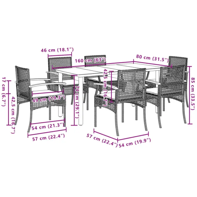 Ta vrtna jedilna garnitura je odlična izbira za večerjo na prostem ali za sprostitev na vrtu, dvorišču ali terasi. Vzdržljiv material: PE ratan, znan tudi kot poli ratan, je močan sintetični material, ki zahteva malo vzdrževanja in je videti kot naravni ratan. Je lahek, enostaven za čiščenje in se zaradi svoje vzdržljivosti in odpornosti na vremenske vplive pogosto uporablja za zunanje pohištvo.Udobno sedenje: To zunanje pohištvo z debelo oblazinjenimi blazinami zagotavlja udobno sedenje.Prevleko je mogoče odstraniti in oprati: Te sedežne blazine imajo odstranljive prevleke za lažje pranje in vzdrževanje.Steklena mizna plošča: Površina zunanje mize je izdelana iz močnega in trpežnega kaljenega stekla, kar omogoča enostavno čiščenje z vlažno krpo in vašemu zunanjemu prostoru doda pridih elegance.Robusten in stabilen okvir: Prašno barvan jekleni okvir zagotavlja, da je vrtno pohištvo močno in stabilno za vsakodnevno uporabo na prostem. Dobro je vedeti:Če želite, da vaše zunanje pohištvo ostane lepo, vam priporočamo, da ga zaščitite z vodoodporno prevleko.Maksimalna nosilnost (na sedež): 110 kgUV-odpornoPotrebno sestavljanje: DaMiza:Barva: ČrnaMaterial: Jeklo s prašnim premazom, kaljeno stekloDimenzije mize: 160 x 80 x 74 cm (D x Š x V)Stol:Barva: SivaMaterial: PE ratan, prašno premazano jeklo, trden akacijev les z oljnim premazomDimenzije: 54 x 57 x 85 cm (Š x G x V)Velikost sedeža: 46,5 x 49 cm (Š x G)Višina sedeža, merjena od tal: 42,5 cmVišina naslonjala za roke, merjena od tal: 59,5 cmBlazina:Barva: Temno sivaMaterial prevleke: Tkanina (100 % poliester)Material polnila: PenaDimenzije blazine klopi: 100 x 48 x 3 cm (Š x G x D)Dimenzije blazine za stol: 46 x 48 x 3 cm (Š x G x D)Paket vsebuje:1 x Vrtna miza6 x Vrtni stol6 x Blazina za stol s snemljivo in pralno prevleko 3213621