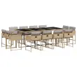 Ta vrtna jedilna garnitura je odlična izbira za večerjo na prostem ali za sprostitev na vrtu, dvorišču ali terasi. Vzdržljiv material: PE ratan, znan tudi kot poli ratan, je močan sintetični material, ki zahteva malo vzdrževanja in je videti kot naravni ratan. Je lahek, enostaven za čiščenje in se zaradi svoje vzdržljivosti in odpornosti na vremenske vplive pogosto uporablja za zunanje pohištvo.Kompaktno shranjevanje: Te stole je mogoče zložiti, zato jih je enostavno shraniti pod mizo. Ko so zloženi, se lepo prilegajo pod mizo in tvorijo prostorsko varčno kocko.Udobno sedenje: To zunanje pohištvo z debelo oblazinjenimi blazinami zagotavlja udobno sedenje.Prevleko je mogoče odstraniti in oprati: Te sedežne blazine imajo odstranljive prevleke za lažje pranje in vzdrževanje. Prevleke za blazine za stole imajo na zadnji strani zavihek za enostavno pritrditev na stole.Steklena mizna plošča: Površina vrtne mize je izdelana iz močnega in trpežnega kaljenega stekla, kar omogoča enostavno čiščenje z vlažno krpo in vašemu zunanjemu prostoru doda pridih elegance. Dobro je vedeti:Če želite, da vaše zunanje pohištvo ostane lepo, vam priporočamo, da ga zaščitite z vodoodporno prevleko.Maksimalna nosilnost (na sedež): 110 kgUV-odpornoPotrebno sestavljanje: DaVrtna miza:Barva: Mešano bežMaterial: PE ratan, jeklo s prašnim premazom, kaljeno stekloDimenzije: 220 x 106 x 73 cm (D x Š x V)Vrtni stol:Barva: Mešano bežMaterial: PE ratan, jeklen okvir s prašnim premazomDimenzije: 50,5 x 54 x 79 cm (Š x G x V)Velikost sedišča: 45,5 x 38 cm (Š x G)Višina sedišča, merjena od tal: 43 cmVišina naslonjal za roke, merjena od tal: 63,5 cmBlazina:Barva: Svetlo sivaMaterial prevleke: Tkanina (100 % poliester)Material polnila: PenaDimenzije: 76 x 46 x 2 cm (Š x G x D)Paket vsebuje:1 x Vrtna miza12 x Vrtni stol12 x Blazina za stol z visokim naslonom s snemljivo in pralno prevleko 3211404