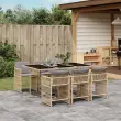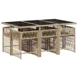 Ta vrtna jedilna garnitura je odlična izbira za večerjo na prostem ali za sprostitev na vrtu, dvorišču ali terasi. Vzdržljiv material: PE ratan, znan tudi kot poli ratan, je močan sintetični material, ki zahteva malo vzdrževanja in je videti kot naravni ratan. Je lahek, enostaven za čiščenje in se zaradi svoje vzdržljivosti in odpornosti na vremenske vplive pogosto uporablja za zunanje pohištvo.Kompaktno shranjevanje: Te stole je mogoče zložiti, zato jih je enostavno shraniti pod mizo. Ko so zloženi, se lepo prilegajo pod mizo in tvorijo prostorsko varčno kocko.Udobno sedenje: To zunanje pohištvo z debelo oblazinjenimi blazinami zagotavlja udobno sedenje.Prevleko je mogoče odstraniti in oprati: Te sedežne blazine imajo odstranljive prevleke za lažje pranje in vzdrževanje. Prevleke za blazine imajo na zadnji strani zavihek za enostavno pritrditev na naslonjala.Steklena mizna plošča: Površina zunanje mize je izdelana iz močnega in trpežnega kaljenega stekla, kar omogoča enostavno čiščenje z vlažno krpo in vašemu zunanjemu prostoru doda pridih elegance. Dobro je vedeti:Če želite, da vaše zunanje pohištvo ostane lepo, vam priporočamo, da ga zaščitite z vodoodporno prevleko.Maksimalna nosilnost (na sedež): 110 kgUV-odpornoPotrebno sestavljanje: DaMiza:Barva: Mešano bežMaterial: PE ratan, jeklo s prašnim premazom, kaljeno stekloDimenzije: 165 x 106 x 73 cm (D x Š x V)Stol:Barva: Mešano bežMaterial: PE ratan, jeklen okvir s prašnim premazomDimenzije: 50,5 x 54 x 79 cm (Š x G x V)Velikost sedišča: 45,5 x 38 cm (Š x G)Višina sedišča, merjena od tal: 43 cmVišina naslonjal za roke, merjena od tal: 63,5 cmBlazina:Barva: Svetlo sivaMaterial prevleke: Tkanina (100 % poliester)Polnilo sedežne blazine: PenaDimenzije sedežne blazine: 76 x 46 x 2 cm (D x Š x D)Paket vsebuje:1 x Vrtna miza6 x Vrtni stol6 x Blazina za stol z visokim naslonom s snemljivo in pralno prevleko 3211632