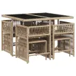 Ta vrtna jedilna garnitura je odlična izbira za večerjo na prostem ali za sprostitev na vrtu, dvorišču ali terasi. Vzdržljiv material: PE ratan, znan tudi kot poli ratan, je močan sintetični material, ki zahteva malo vzdrževanja in je videti kot naravni ratan. Je lahek, enostaven za čiščenje in se zaradi svoje vzdržljivosti in odpornosti na vremenske vplive pogosto uporablja za zunanje pohištvo.Kompaktno shranjevanje: Te stole je mogoče zložiti, zato jih je enostavno shraniti pod mizo. Ko so zloženi, se lepo prilegajo pod mizo in tvorijo prostorsko varčno kocko.Udobno sedenje: To zunanje pohištvo z debelo oblazinjenimi blazinami zagotavlja udobno sedenje.Prevleko je mogoče odstraniti in oprati: Te sedežne blazine imajo odstranljive prevleke za lažje pranje in vzdrževanje. Prevleke za blazine imajo na zadnji strani zavihek za enostavno pritrditev na naslonjala.Steklena mizna plošča: Površina zunanje mize je izdelana iz močnega in trpežnega kaljenega stekla, kar omogoča enostavno čiščenje z vlažno krpo in vašemu zunanjemu prostoru doda pridih elegance. Dobro je vedeti:Če želite, da vaše zunanje pohištvo ostane lepo, vam priporočamo, da ga zaščitite z vodoodporno prevleko.Maksimalna nosilnost (na sedež): 110 kgUV-odpornoPotrebno sestavljanje: DaMiza:Barva: Mešano bežMaterial: PE ratan, jeklo s prašnim premazom, kaljeno stekloDimenzije: 110 x 106 x 73 cm (D x Š x V)Stol:Barva: Mešano bežMaterial: PE ratan, jeklen okvir s prašnim premazomDimenzije: 50,5 x 54 x 79 cm (Š x G x V)Velikost sedišča: 45,5 x 38 cm (Š x G)Višina sedišča, merjena od tal: 43 cmVišina naslonjal za roke, merjena od tal: 63,5 cmStolček:Barva: Mešano bežMaterial: PE ratan, jeklen okvir s prašnim premazomDimenzije: 41 x 41 x 36 cm (Š x G x V)Blazina:Barva: Svetlo sivaMaterial prevleke: Tkanina (100 % poliester)Material polnila: PenaDimenzije sedežne blazine: 76 x 46 x 2 cm (D x Š x D)Dimenzije blazine za stolček: 40 x 40 x 2 cm (Š x G x D)Paket vsebuje:1 x Vrtna miza4 x Vrtni stol4 x Vrtni stolček4 x Blazina za stol z visokim naslonom s snemljivo in pralno prevleko4 x Blazina za stolček s snemljivo in pralno prevleko 3211680