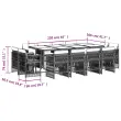 Ta vrtna jedilna garnitura je odlična izbira za večerjo na prostem ali za sprostitev na vrtu, dvorišču ali terasi. Vzdržljiv material: PE ratan, znan tudi kot poli ratan, je močan sintetični material, ki zahteva malo vzdrževanja in je videti kot naravni ratan. Je lahek, enostaven za čiščenje in se zaradi svoje vzdržljivosti in odpornosti na vremenske vplive pogosto uporablja za zunanje pohištvo.Kompaktno shranjevanje: Te stole je mogoče zložiti, zato jih je enostavno shraniti pod mizo. Ko so zloženi, se lepo prilegajo pod mizo in tvorijo prostorsko varčno kocko.Udobno sedenje: To zunanje pohištvo z debelo oblazinjenimi blazinami zagotavlja udobno sedenje.Prevleko je mogoče odstraniti in oprati: Te blazine imajo odstranljive prevleke za lažje pranje in vzdrževanje. Prevleke za blazine za stole imajo na zadnji strani zavihek za enostavno pritrditev na stole.Steklena mizna plošča: Površina zunanje mize je izdelana iz močnega in trpežnega kaljenega stekla, kar omogoča enostavno čiščenje z vlažno krpo in vašemu zunanjemu prostoru doda pridih elegance. Dobro je vedeti: Če želite, da vaše zunanje pohištvo ostane lepo, vam priporočamo, da ga zaščitite z vodoodporno prevleko.Maksimalna nosilnost (na sedež): 110 kgUV-odpornoPotrebno sestavljanje: DaMiza:Barva: Mešana bež in črnaMaterial: PE ratan, jeklo s prašnim premazom, kaljeno stekloDimenzije: 220 x 106 x 73 cm (D x Š x V)Stol:Barva: Mešano bežMaterial: PE ratan, jeklen okvir s prašnim premazomDimenzije: 50,5 x 54 x 79 cm (Š x G x V)Velikost sedišča: 45,5 x 38 cm (Š x G)Višina sedišča, merjena od tal: 43 cmVišina naslonjal za roke, merjena od tal: 63,5 cmBlazina:Barva: Svetlo sivaMaterial prevleke: Tkanina (100 % poliester)Material polnila: PenaDimenzije blazine za stol: 76 x 46 x 2 cm (D x Š x D)Paket vsebuje:1 x Vrtna miza12 x Vrtni stol12 x Blazina za stol z visokim naslonom s snemljivo in pralno prevleko 3211044