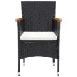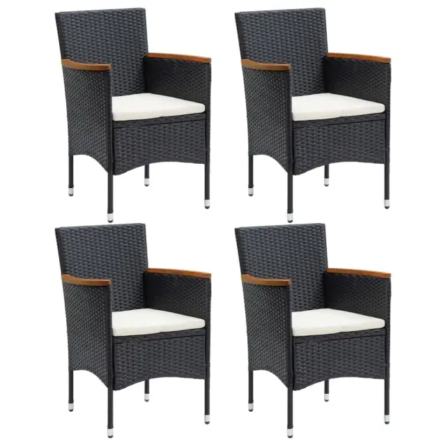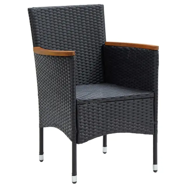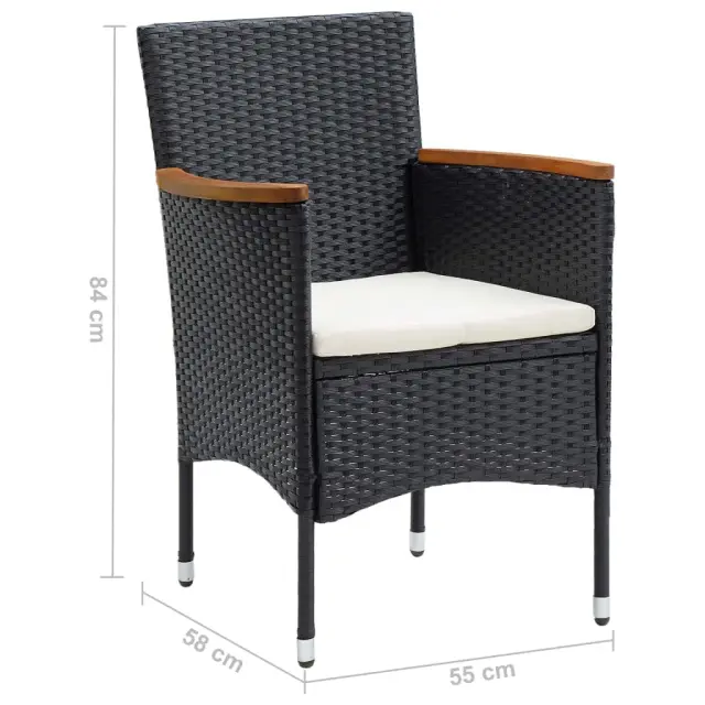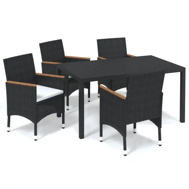 Ta vrtna jedilna garnitura predstavlja popolno kombinacijo stila in uporabnosti. Postala bo ključna točka vašega vrta, balkona ali terase. Robusten jeklen okvir, ovit z vremensko odpornim PE ratanom, je odporen na rjo in plesen ter zagotavlja dolgoletno kakovostno sprostitev. Naslonjala za roke so čudovito okrašena s trdnim akacijevim lesom z naravnim oljnim premazom, ki daje pridih rustikalnega šarma. Miza za zunanjo uporabo ima mizno ploščo iz WPC, ki je enostavna za čiščenje in primerna za uporabo na prostem. Stabilnost in trdnost zagotavlja tudi aluminijasti okvir. Debelo podložene blazine zagotavljajo izjemno udobje med sedenjem. Ta jedilni set za teraso je zaradi lahke konstrukcije enostaven za premikanje. Opomba: Da bi podaljšali življenjsko dobo vašega zunanjega pohištva, vam priporočamo, da ga zaščitite z vodoodporno prevleko.mizaBarva: ČrnaMaterial: WPC, aluminijDimenzije: 150 x 90 x 74 cm (D x Š x V)StolBarva PE ratana: ČrnaBarva blazin: Kremno belaMaterial: PE ratan, jeklo, blago (100 % poliester), trden akacijev les z naravnim oljnim premazomDimenzije: 55 x 58 x 84 cm (Š x G x V)Velikost sedeža: 39/44,5 x 46 cm (Š x G)Višina sedeža, merjena od tal: 42 cmVišina naslonjala za roke, merjena od tal: 62/65 cmDebelina blazine za sedež: 4 cmPotrebno sestavljanje: DaPaket vsebuje:1 x Miza4 x Stol4 x Blazina za sedež 3095017