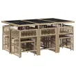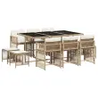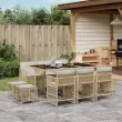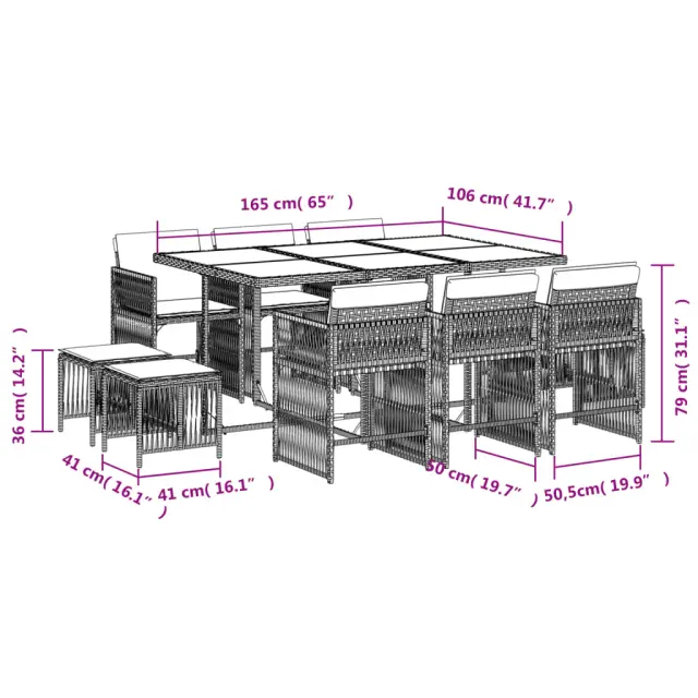 Ta vrtna jedilna garnitura je odlična izbira za večerjo na prostem ali za sprostitev na vrtu, dvorišču ali terasi. Vzdržljiv material: PE ratan, znan tudi kot poli ratan, je močan sintetični material, ki zahteva malo vzdrževanja in je videti kot naravni ratan. Je lahek, enostaven za čiščenje in se zaradi svoje vzdržljivosti in odpornosti na vremenske vplive pogosto uporablja za zunanje pohištvo.Kompaktno shranjevanje: Te stole je mogoče zložiti, zato jih je enostavno shraniti pod mizo. Ko so zloženi, se lepo prilegajo pod mizo in tvorijo prostorsko varčno kocko.Udobno sedenje: To zunanje pohištvo z debelo oblazinjenimi blazinami zagotavlja udobno sedenje.Prevleko je mogoče odstraniti in oprati: Te sedežne blazine imajo odstranljive prevleke za lažje pranje in vzdrževanje. Prevleke za blazine imajo na zadnji strani zavihek za enostavno pritrditev na naslonjala.Steklena mizna plošča: Površina zunanje mize je izdelana iz močnega in trpežnega kaljenega stekla, kar omogoča enostavno čiščenje z vlažno krpo in vašemu zunanjemu prostoru doda pridih elegance. Dobro je vedeti:Če želite, da vaše zunanje pohištvo ostane lepo, vam priporočamo, da ga zaščitite z vodoodporno prevleko.Maksimalna nosilnost (na sedež): 110 kgUV-odpornoPotrebno sestavljanje: DaMiza:Barva: BežMaterial: PE ratan, jeklo s prašnim premazom, kaljeno stekloDimenzije: 165 x 106 x 73 cm (D x Š x V)Stol:Barva: BežMaterial: PE ratan, jeklen okvir s prašnim premazomDimenzije: 50,5 x 54 x 79 cm (Š x G x V)Velikost sedišča: 45,5 x 38 cm (Š x G)Višina sedišča, merjena od tal: 43 cmVišina naslonjal za roke, merjena od tal: 63,5 cmStolček:Barva: BežMaterial: PE ratan, jeklen okvir s prašnim premazomDimenzije: 41 x 41 x 36 cm (Š x G x V)Blazina:Barva: Kremno belaMaterial prevleke: Tkanina (100 % poliester)Material polnila: PenaDimenzije sedežne blazine: 76 x 46 x 2 cm (D x Š x D)Dimenzije blazine za stolček: 40 x 40 x 2 cm (Š x G x D)Paket vsebuje:1 x Vrtna miza6 x Vrtni stol4 x Vrtni stolček6 x Blazina za stol z visokim naslonom s snemljivo in pralno prevleko4 x Blazina za stolček s snemljivo in pralno prevleko 3211690