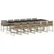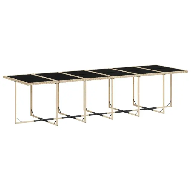 Ta vrtna jedilna garnitura je odlična izbira za večerjo na prostem ali za sprostitev na vrtu, dvorišču ali terasi. Vzdržljiv material: PE ratan, znan tudi kot poli ratan, je močan sintetični material, ki zahteva malo vzdrževanja in je videti kot naravni ratan. Je lahek, enostaven za čiščenje in se zaradi svoje vzdržljivosti in odpornosti na vremenske vplive pogosto uporablja za zunanje pohištvo.Kompaktno shranjevanje: Te stole je mogoče zložiti, zato jih je enostavno shraniti pod mizo. Ko so zloženi, se lepo prilegajo pod mizo in tvorijo prostorsko varčno kocko.Udobno sedenje: To zunanje pohištvo z debelo oblazinjenimi blazinami zagotavlja udobno sedenje.Prevleko je mogoče odstraniti in oprati: Te sedežne blazine imajo odstranljive prevleke za lažje pranje in vzdrževanje. Prevleke za blazine imajo na zadnji strani zavihek za enostavno pritrditev na naslonjala.Steklena mizna plošča: Površina zunanje mize je izdelana iz močnega in trpežnega kaljenega stekla, kar omogoča enostavno čiščenje z vlažno krpo in vašemu zunanjemu prostoru doda pridih elegance. Dobro je vedeti:Če želite, da vaše zunanje pohištvo ostane lepo, vam priporočamo, da ga zaščitite z vodoodporno prevleko.Maksimalna nosilnost (na sedež): 110 kgUV-odpornoPotrebno sestavljanje: DaMiza:Barva mize: Mešano bežBarva stekla: ČrnaMaterial: PE ratan, jeklo s prašnim premazom, kaljeno stekloDimenzije: 330 x 106 x 73 cm (D x Š x V)Stol:Barva: Mešano bežMaterial: PE ratan, jeklen okvir s prašnim premazomDimenzije: 50,5 x 50 x 79 cm (Š x G x V)Velikost sedišča: 45,5 x 38 cm (Š x G)Višina sedeža, merjena od tal: 43,5 cmVišina naslonjal za roke, merjena od tal: 63,5 cmBlazina:Barva: Svetlo sivaMaterial prevleke: Tkanina (100 % poliester)Material polnila: PenaDimenzije blazine za stol: 76 x 45,5 x 2 cm (D x Š x D)Paket vsebuje:1 x Vrtna miza12 x Vrtni stol12 x Blazina za stol z visokim naslonom s snemljivo in pralno prevleko 3211488