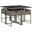 Ta vrtna jedilna garnitura je odlična izbira za večerjo na prostem ali za sprostitev na vrtu, dvorišču ali terasi. Vzdržljiv material: PE ratan, znan tudi kot poli ratan, je močan sintetični material, ki zahteva malo vzdrževanja in je videti kot naravni ratan. Je lahek, enostaven za čiščenje in se zaradi svoje vzdržljivosti in odpornosti na vremenske vplive pogosto uporablja za zunanje pohištvo.Kompaktno shranjevanje: Te stole je mogoče zložiti, zato jih je enostavno shraniti pod mizo. Ko so zloženi, se lepo prilegajo pod mizo in tvorijo prostorsko varčno kocko.Udobno sedenje: To zunanje pohištvo z debelo oblazinjenimi blazinami zagotavlja udobno sedenje.Prevleko je mogoče odstraniti in oprati: Te sedežne blazine imajo odstranljive prevleke za lažje pranje in vzdrževanje. Prevleke za blazine imajo na zadnji strani zavihek za enostavno pritrditev na naslonjala.Steklena mizna plošča: Površina zunanje mize je izdelana iz močnega in trpežnega kaljenega stekla, kar omogoča enostavno čiščenje z vlažno krpo in vašemu zunanjemu prostoru doda pridih elegance. Dobro je vedeti:Če želite, da vaše zunanje pohištvo ostane lepo, vam priporočamo, da ga zaščitite z vodoodporno prevleko.Maksimalna nosilnost (na sedež): 110 kgUV-odpornoPotrebno sestavljanje: DaMiza:Barva mize: SivaBarva stekla: ČrnaMaterial: PE ratan, jeklo s prašnim premazom, kaljeno stekloDimenzije: 110 x 106 x 73 cm (D x Š x V)Stol:Barva: SivaMaterial: PE ratan, jeklen okvir s prašnim premazomDimenzije: 50,5 x 50 x 79 cm (Š x G x V)Velikost sedišča: 45,5 x 38 cm (Š x G)Višina sedišča, merjena od tal: 43 cmVišina naslonjal za roke, merjena od tal: 63,5 cmBlazina:Barva: Temno sivaMaterial prevleke: Tkanina (100 % poliester)Material polnila: PenaDimenzije blazine za stol: 76 x 45,5 x 2 cm (D x Š x D)Paket vsebuje:1 x Vrtna miza4 x Vrtni stol4 x Blazina za stol z visokim naslonom s snemljivo in pralno prevleko 3211256